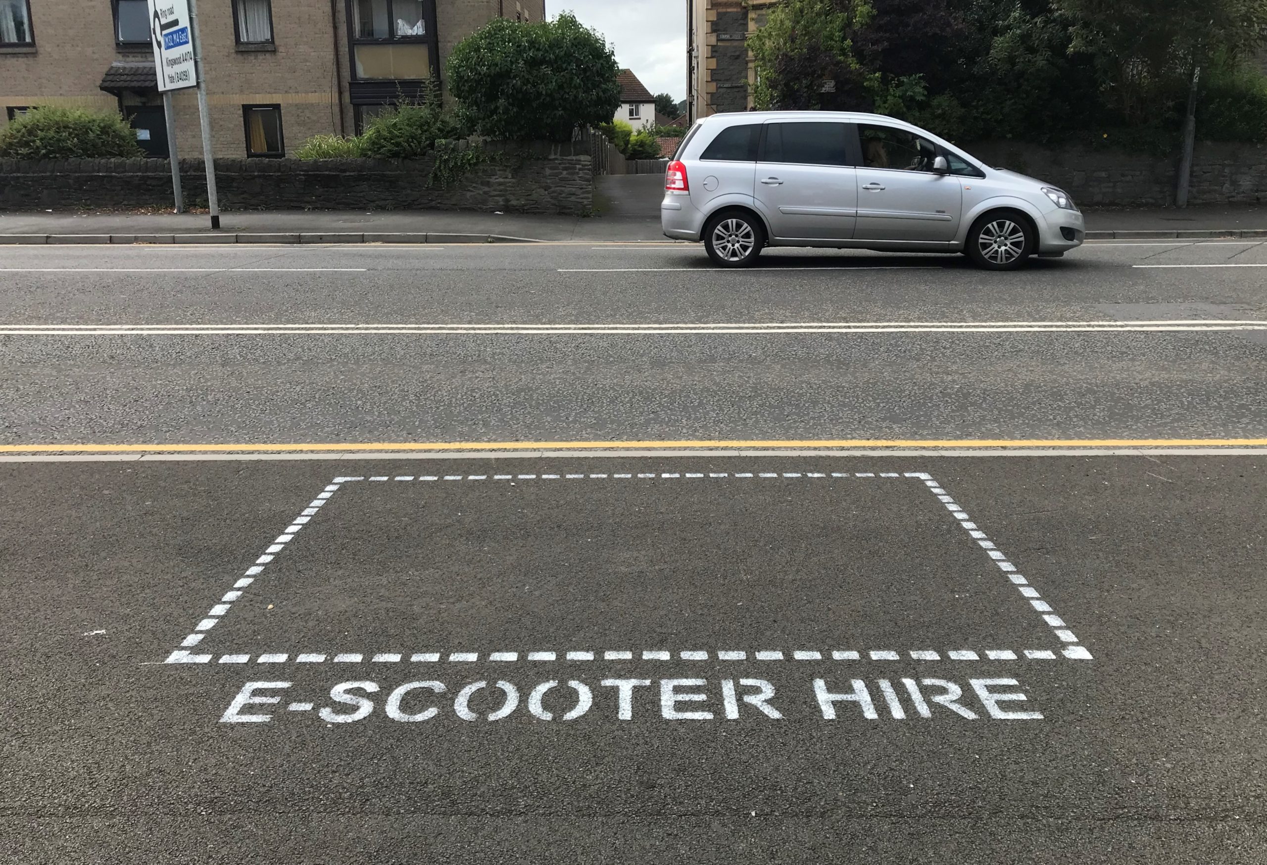 A painted e-scooter parking area on Gloucester Road North near Elm Park in Filton – photo: Martin Booth