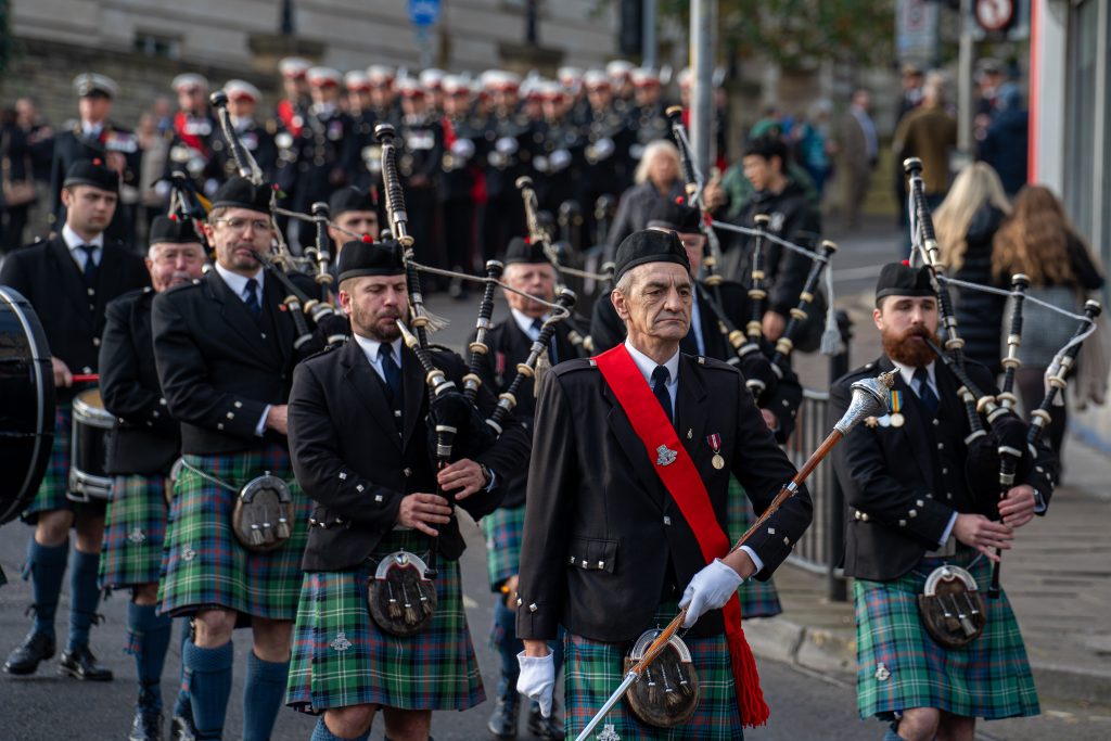 Set to the sound of bagpipes and orders being bellowed, the occasional older man standing in the crowd saluted the oncoming units as they slowly occupied the street.