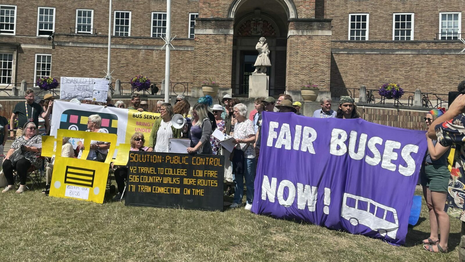 Campaigners gathered on College Green on Friday to celebrate the launch of a petition appealing to metro mayor Dan Norris to bring bus services back under public control.