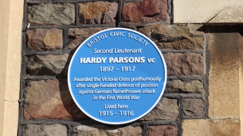 100 years to the day after King George V posthumously awarded his father with a Victoria Cross on his behalf in a ceremony on the Downs, a blue plaque commemorating the life of Second Lieutenant Hardy Falconer Parsons has been unveiled at his former home in Redland.
