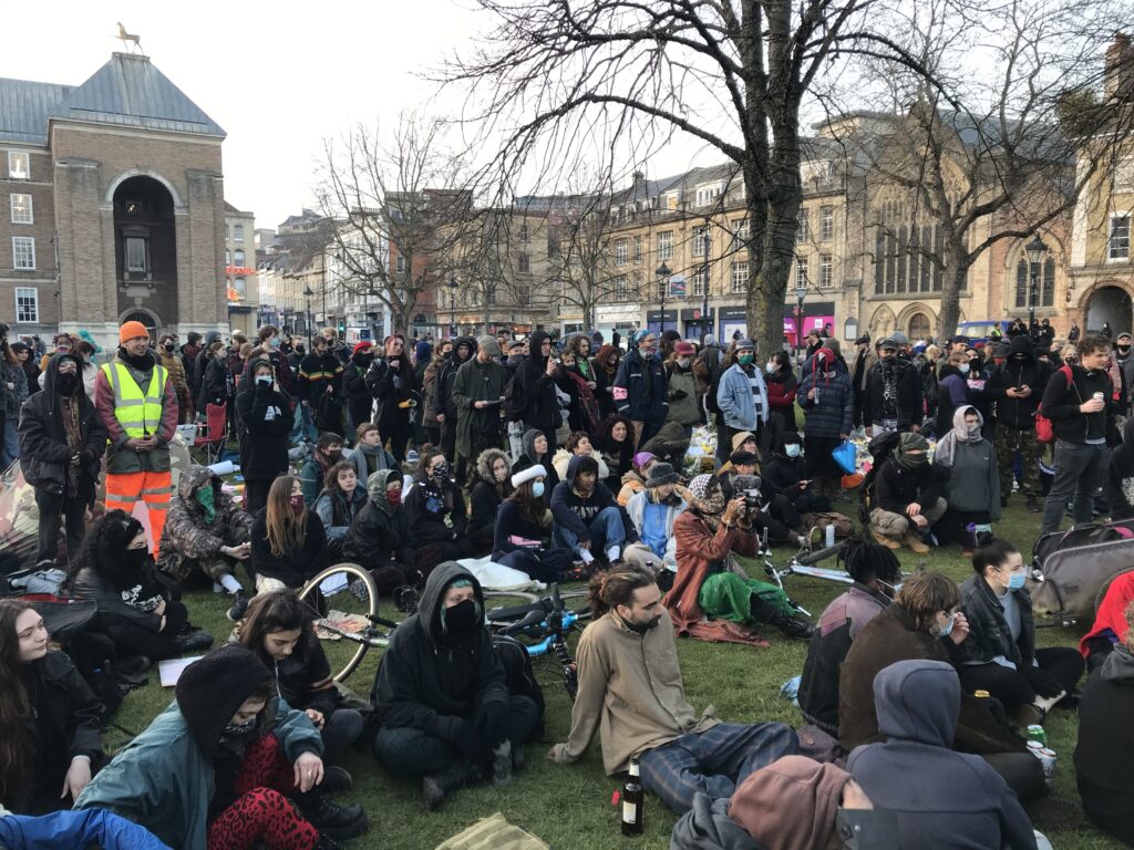 Peaceful protesters on College Green on March 23 2021 before the arrival of riot police after dark – photo: Martin Booth