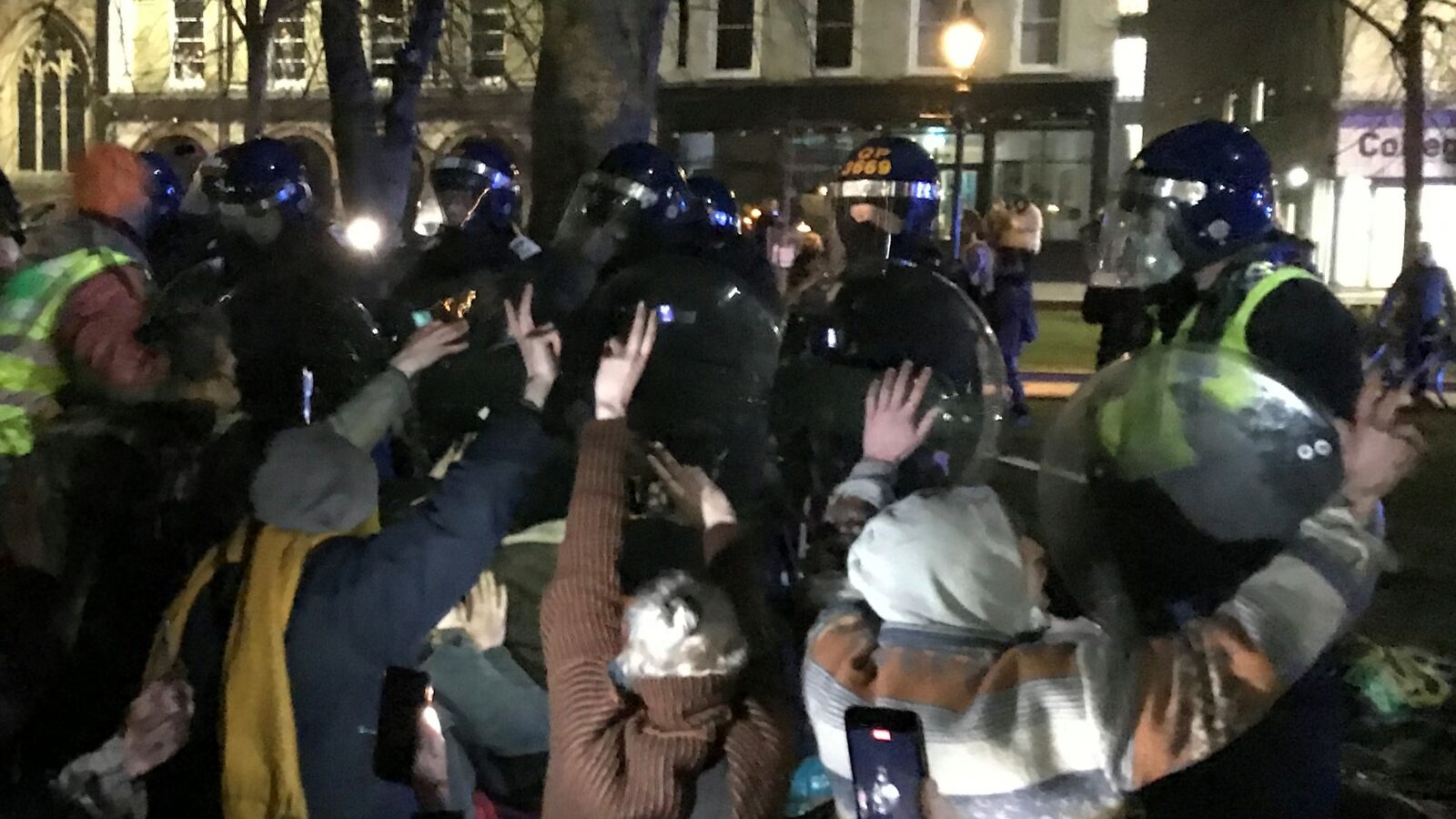 Protesters claim that they were assaulted by police officers who violently cleared them from College Green after a day of speeches, songs and art.