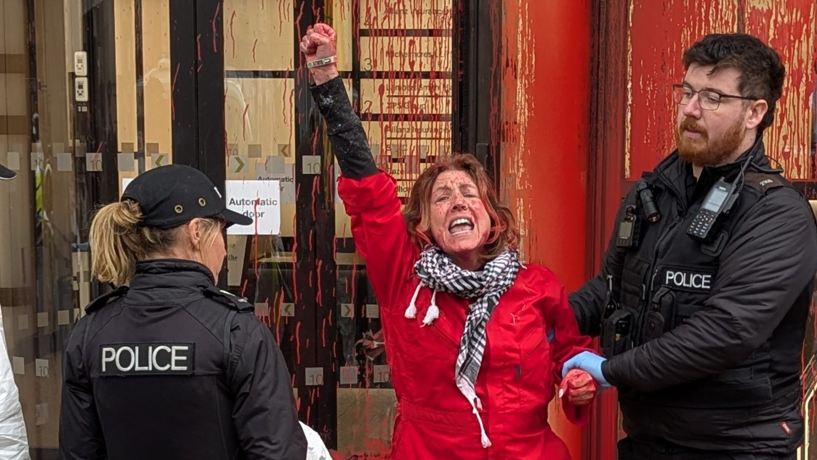 Protesters sprayed red paint and blocked access to the building on Victoria Street on Monday morning in one of a series of coordinated protests across the UK.