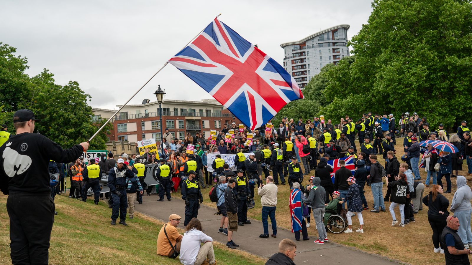 Police have put themselves in the middle of two opposing groups in Castle Park. Around 100 counter-protesters are facing off against dozens of people gathered for ‘the Great British National Strike’ who oppose illegal immigration, net zero and ‘two-tier justice’. pic.twitter.com/NDwcej6kYr