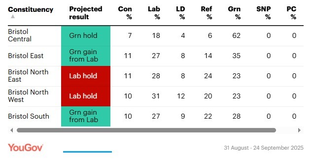 YouGov’s seat-by-seat MRP poll projects that Labour would hold its three seats in Bristol North West, Bristol North East and Filton and Bradley Stoke.