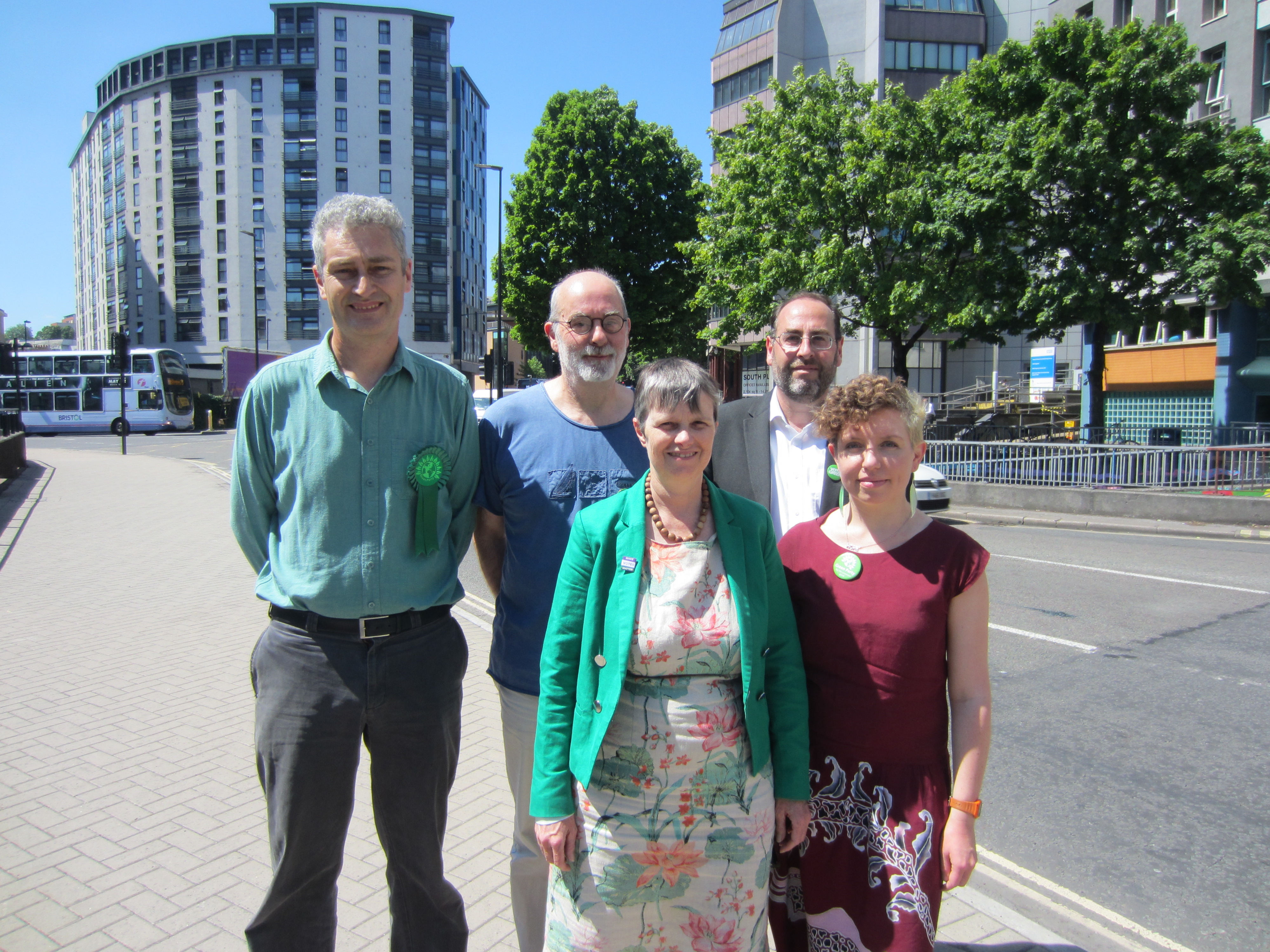 Jerome Thomas (pictured on the far left with fellow Green Party members in one of Bristol’s most congested spots) says action to combat air pollution needs to include a clampdown on diesel engines