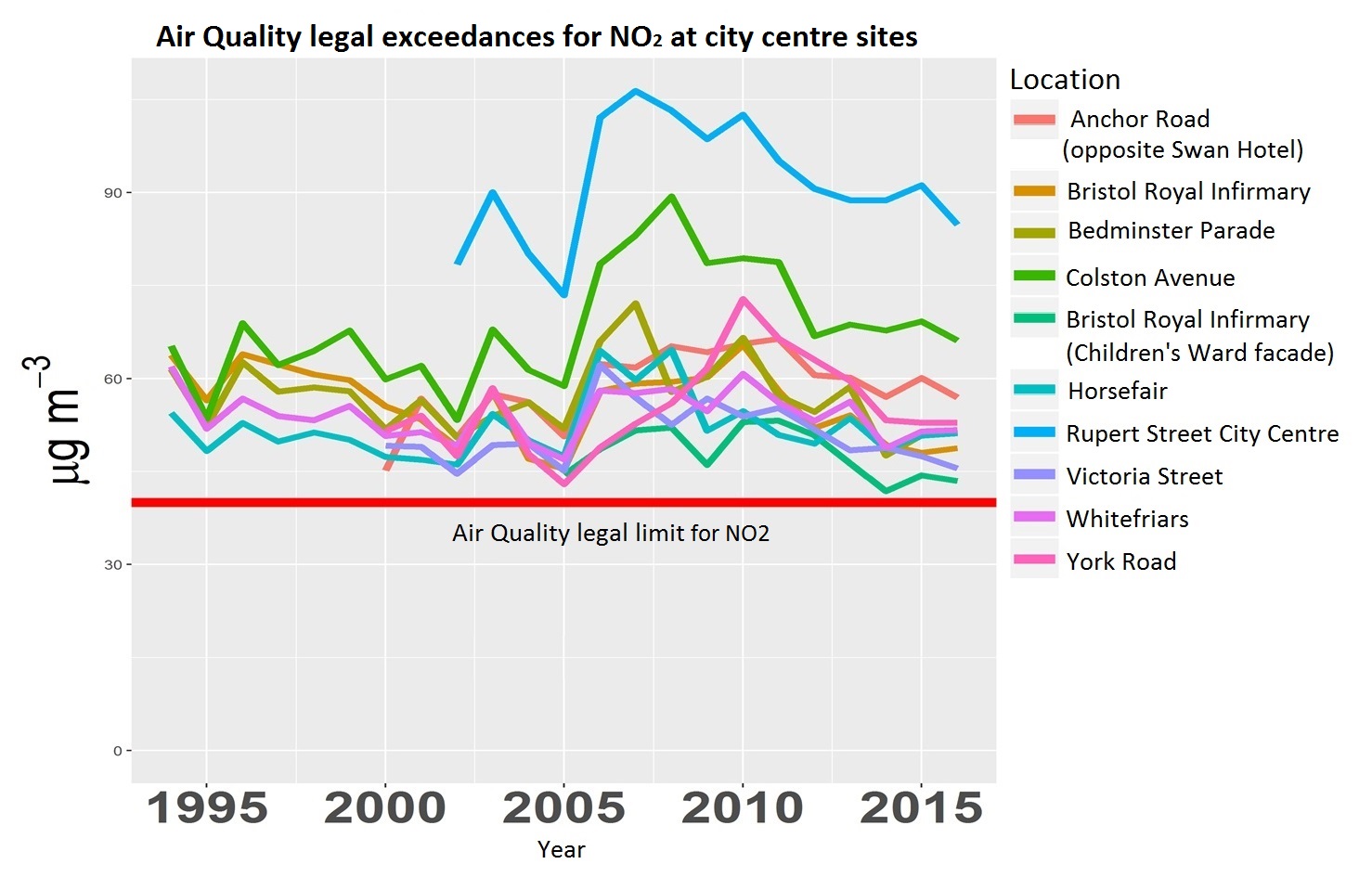 Graph showing areas in Bristol where recorded NO2 levels exceed the legal limit