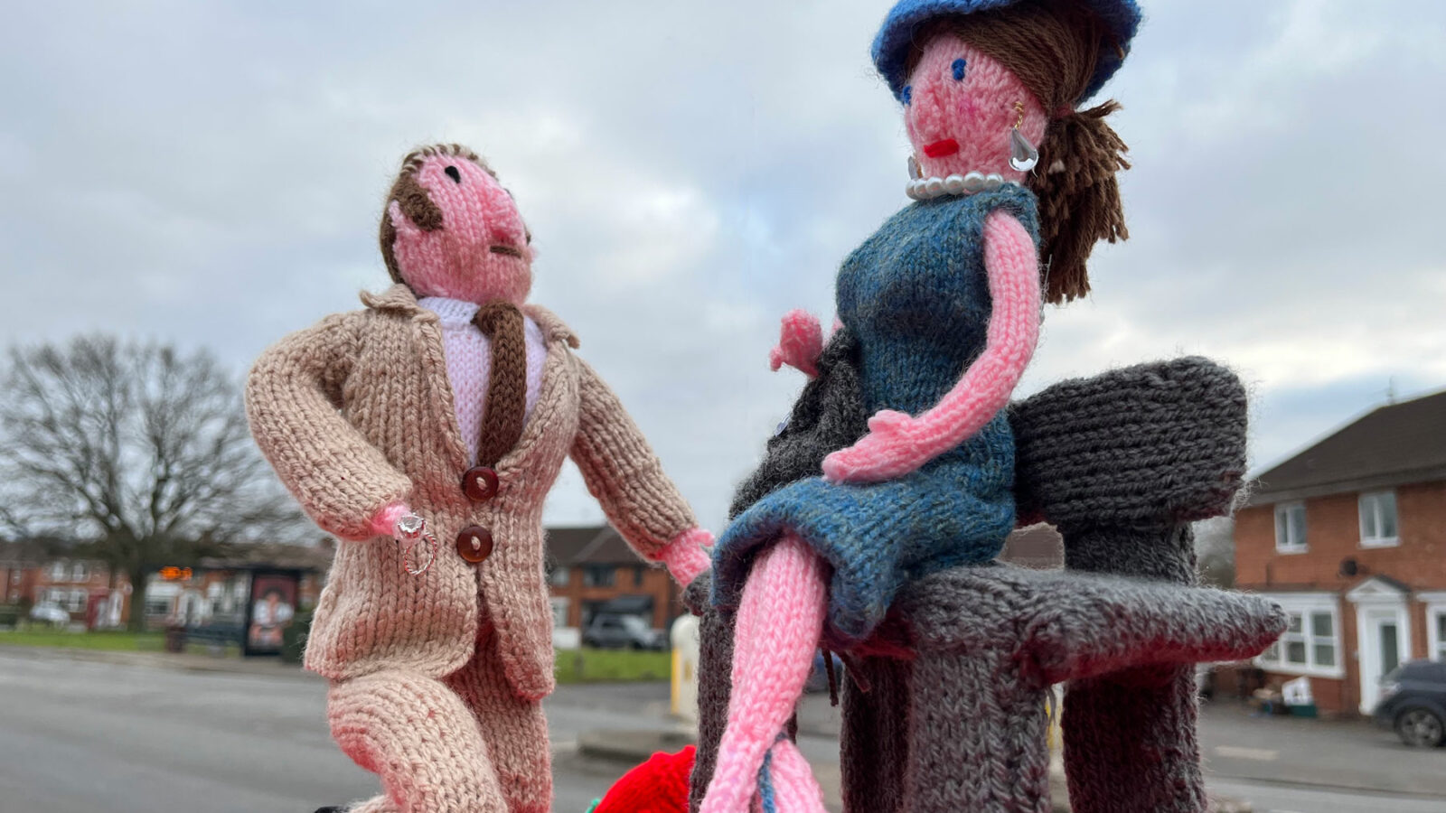 The knitted scene depicts a kneeling man presenting a ring to a demure-looking lady who is sitting on a park bench.