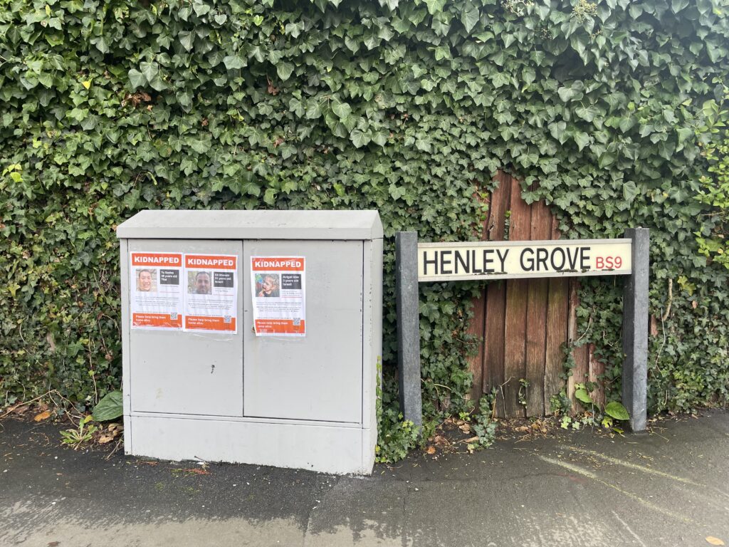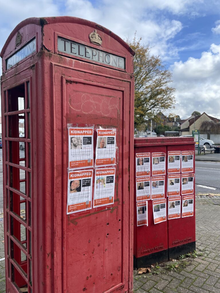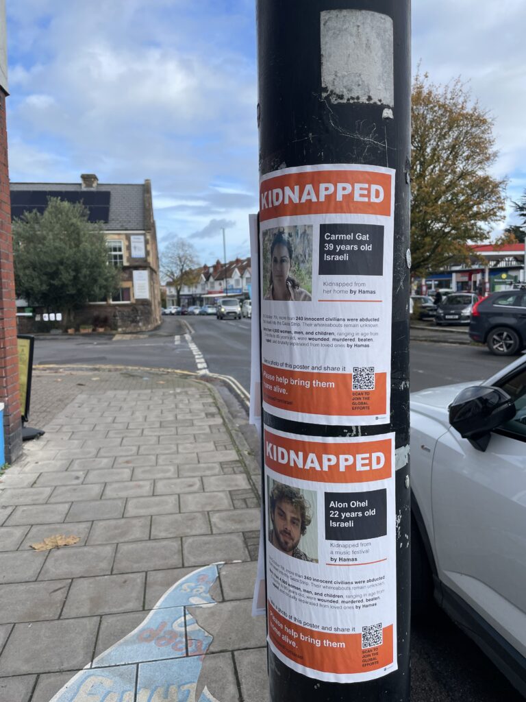 ‘Kidnapped from a music festival by Hamas’, ‘Kidnapped from her home’ by Hamas, ‘Kidnapped from his home by Hamas’ say the posters in Henleaze.