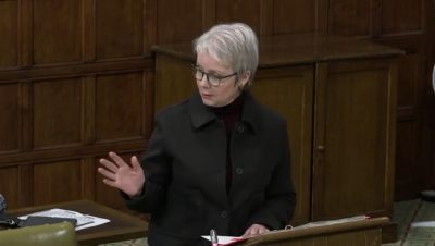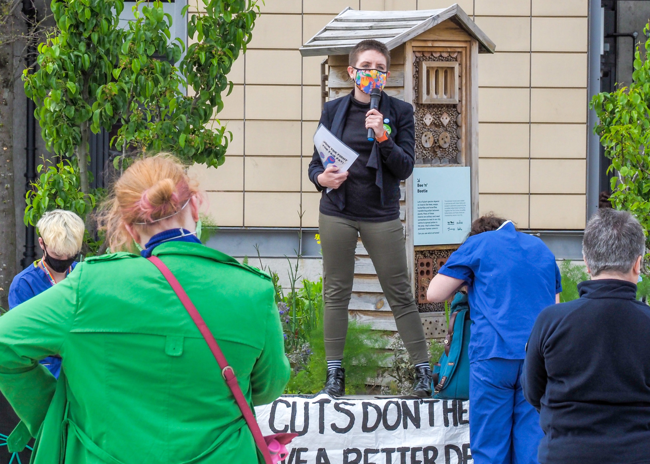 Green Party councillor and prospective Bristol West MP Carla Denyer speaks on Millennium Square during the NHS protest – photo: Rob Browne