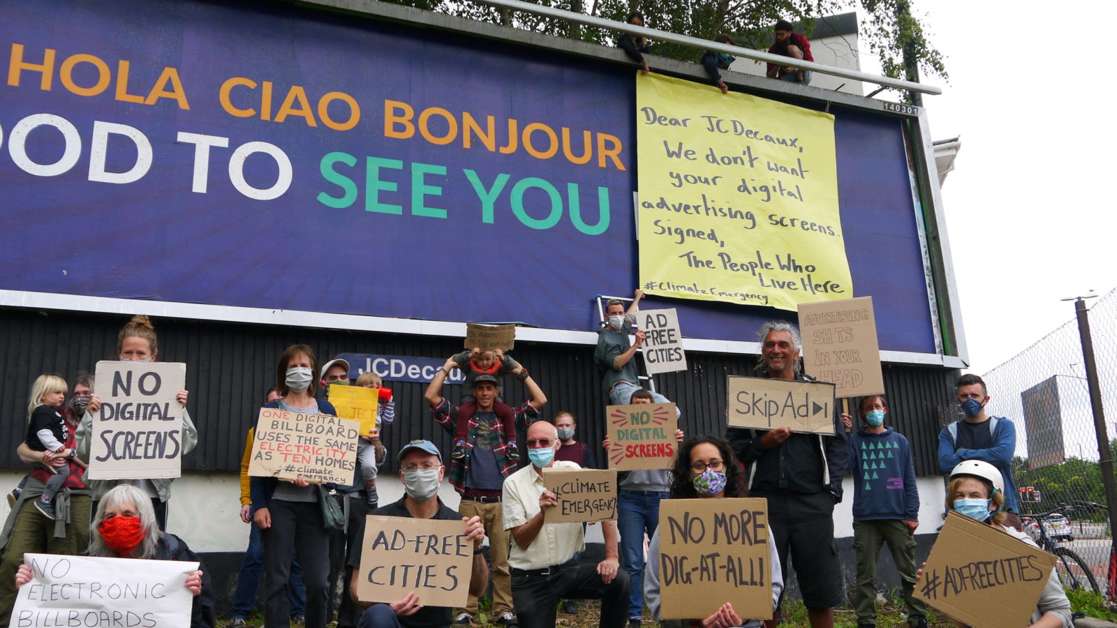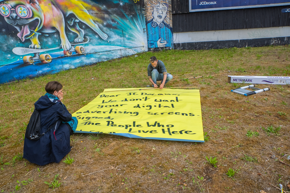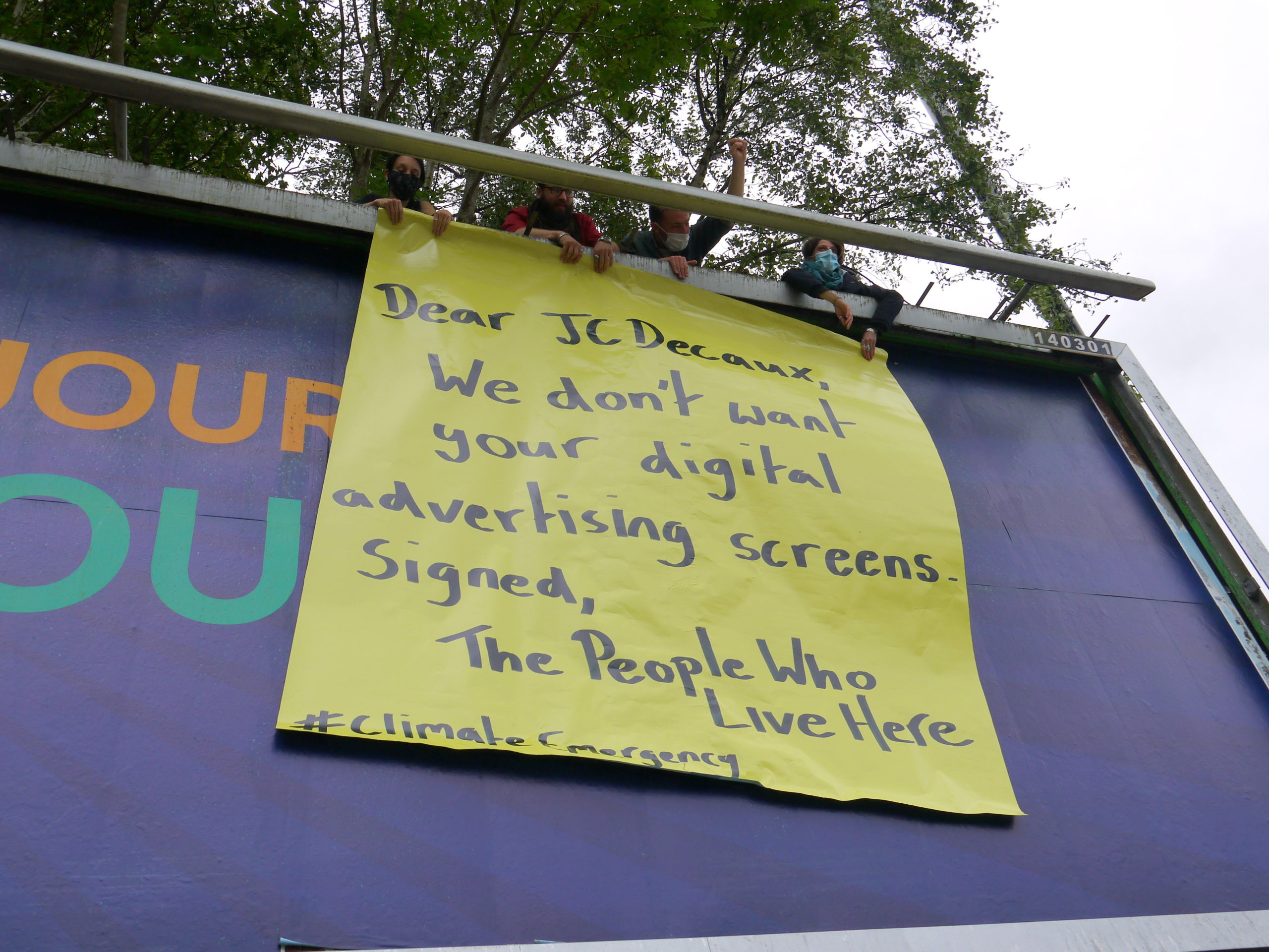“Dear JCDecaux, we don’t want your digital advertising screens. Signed, The People Who Live Here #ClimateEmergency,” read the homemade sign affixed to the vast hoarding as part of a protest that took place on Saturday, July 18.