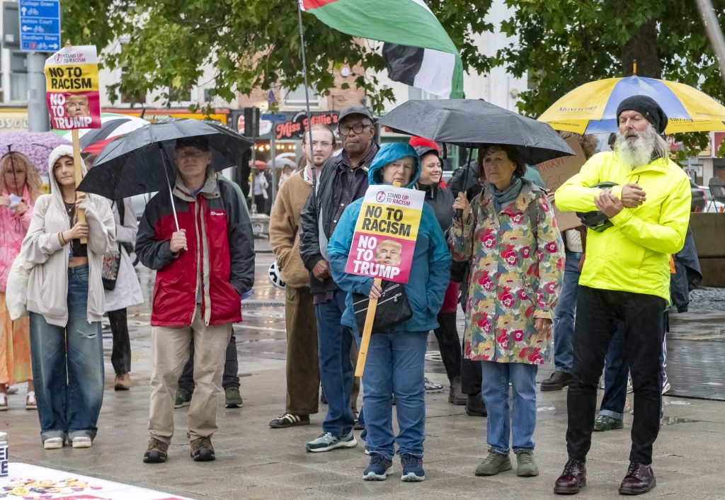 A few dozen people gathered by the Cascade Steps to protest against Donald Trump’s current visit to the UK.