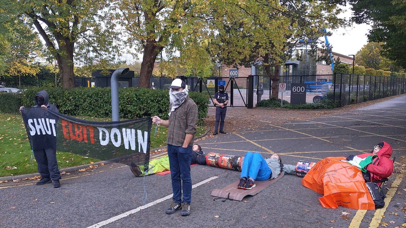 Video footage posted on social media depicted protesters lying down on the road outside Elbit System in Aztec West, Patchway, with a banner reading ‘shut Elbit down’.