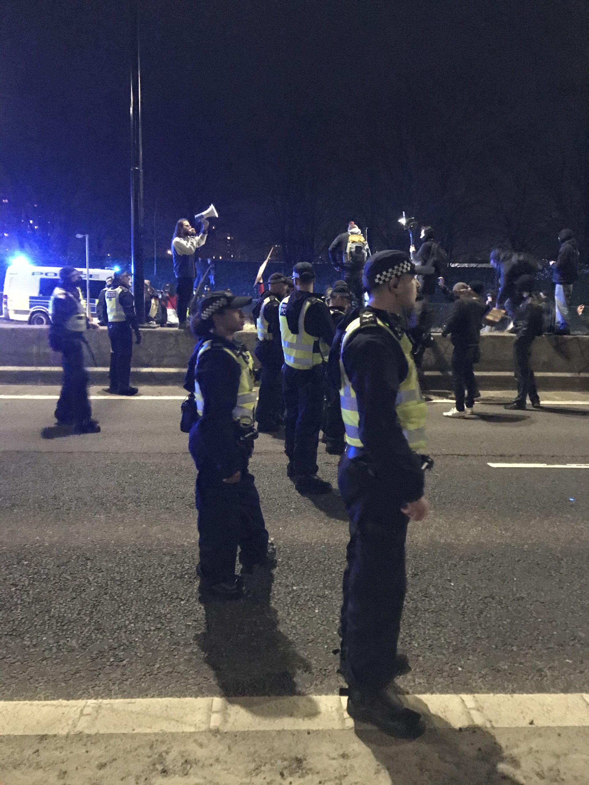 The line stopped next to Bristol Bridge and soon before 1.30am on the morning of Easter Sunday, protesters were chased into Castle Park by police dogs, drawing the day’s events to a swift conclusion as the last remaining people dispersed via exits of the park including near Union Street and Old Market roundabout.