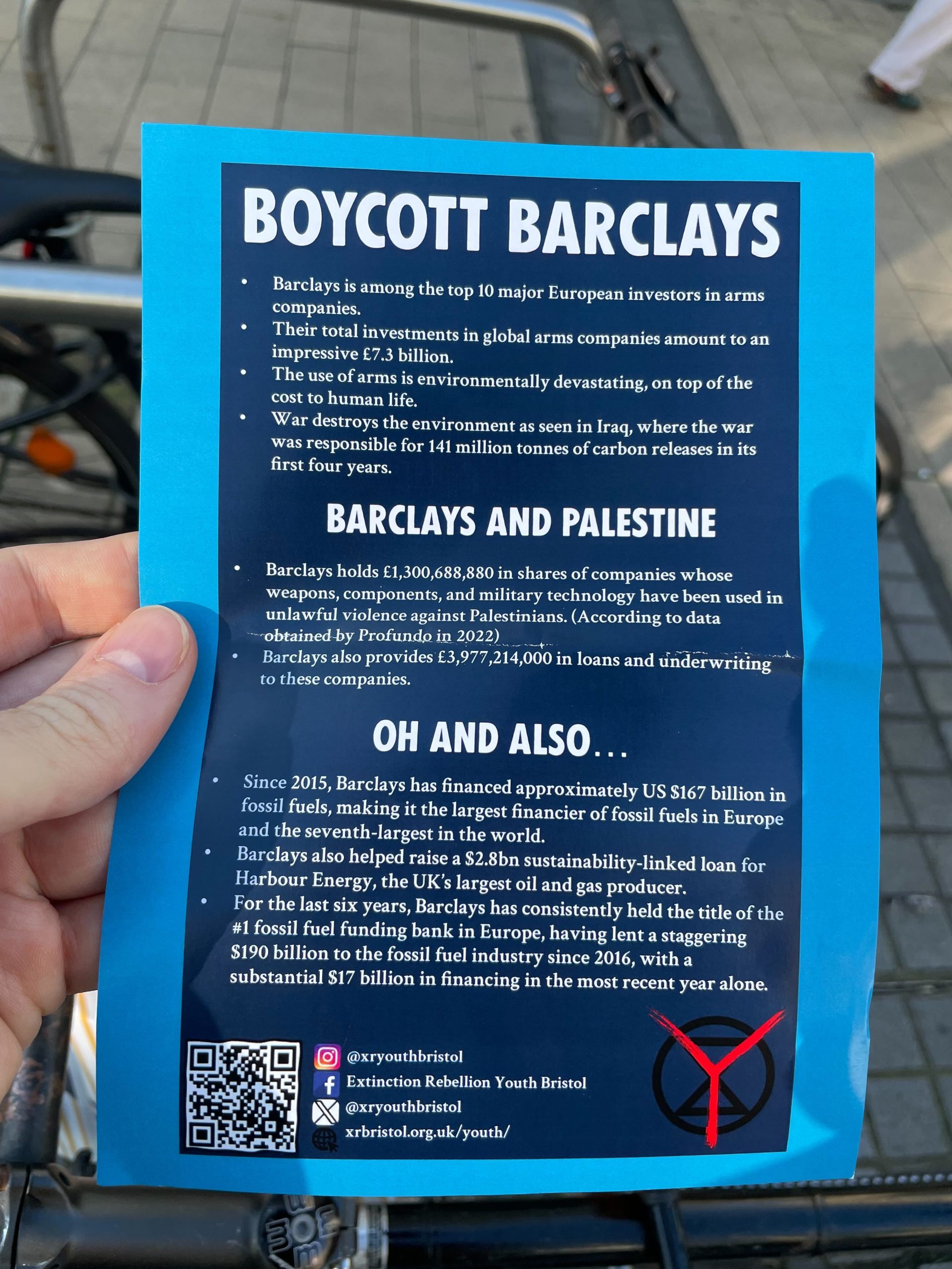 Extinction Rebellion Youth Bristol (XR), the group behind the protest, have been standing outside the branch with posters and banners, as well as distributing leaflets to people passing by.