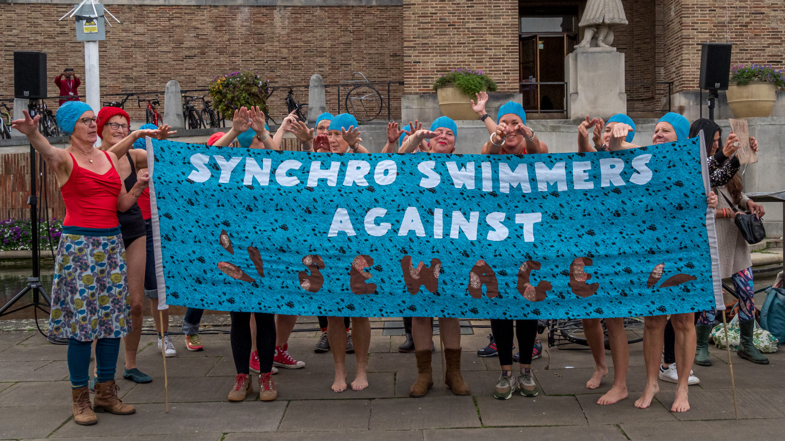 Swimmers danced outside Bristol City Council in support of the petition – photo: Rob Browne