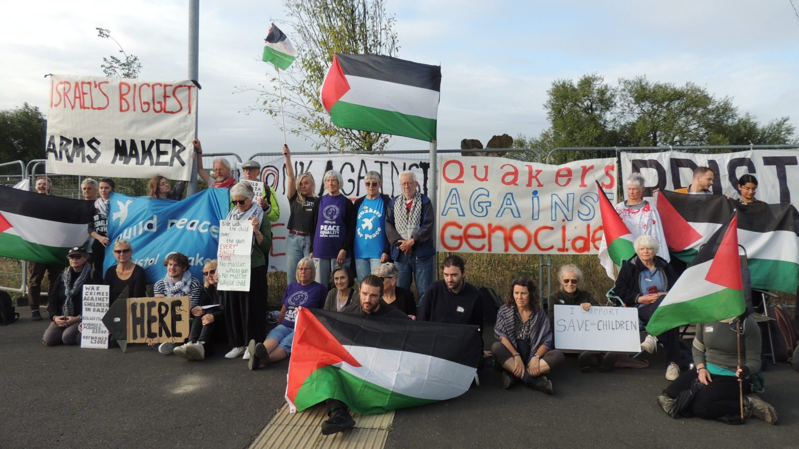 Starting at around 7.30am on Thursday, around 25 protestors stood peacefully with signs and banners in front of the entrance to Elbit’s facility in Filton, which was barricaded and protected by four security guards.