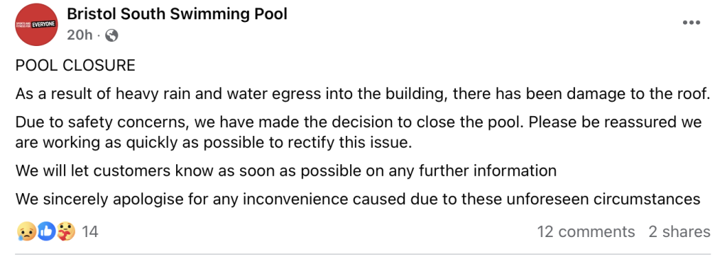 In a Facebook post, the venue announced the immediate closure of the pool – photo: Bristol South Swimming Pool