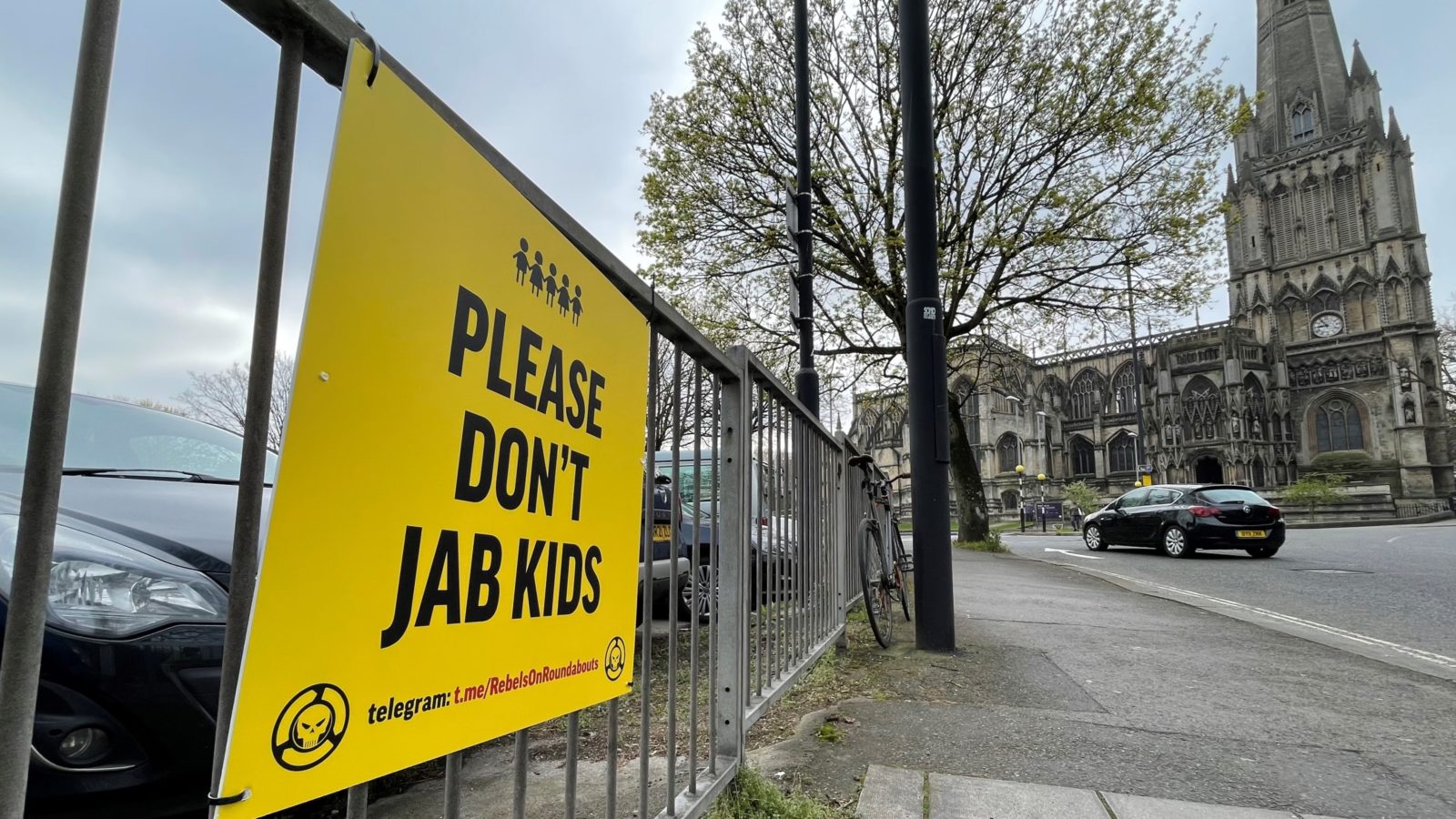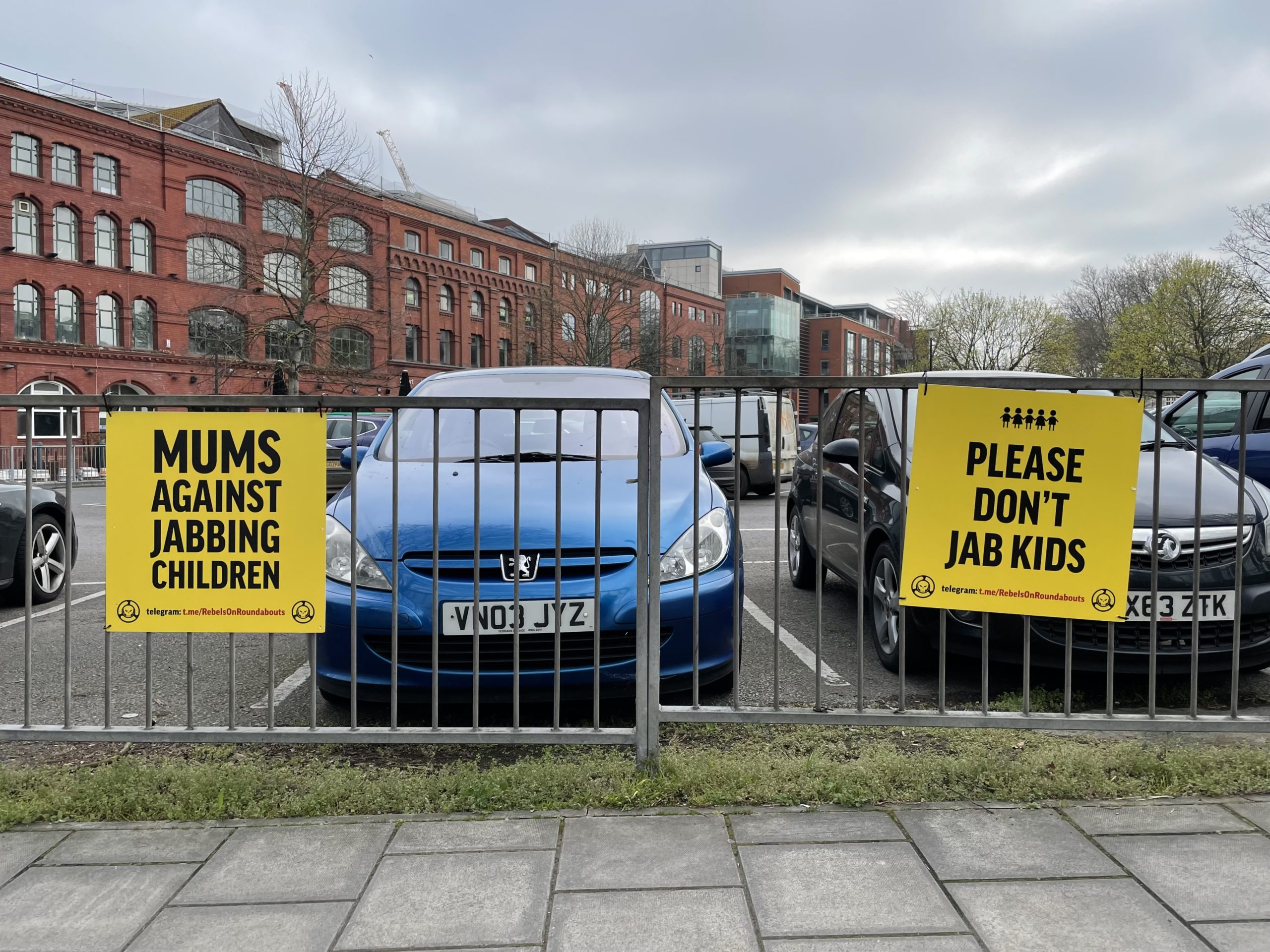 The signs attached to the railings of the Portwall Lane car park read ‘mums against jabbing children’ and ‘please don’t jab kids’.