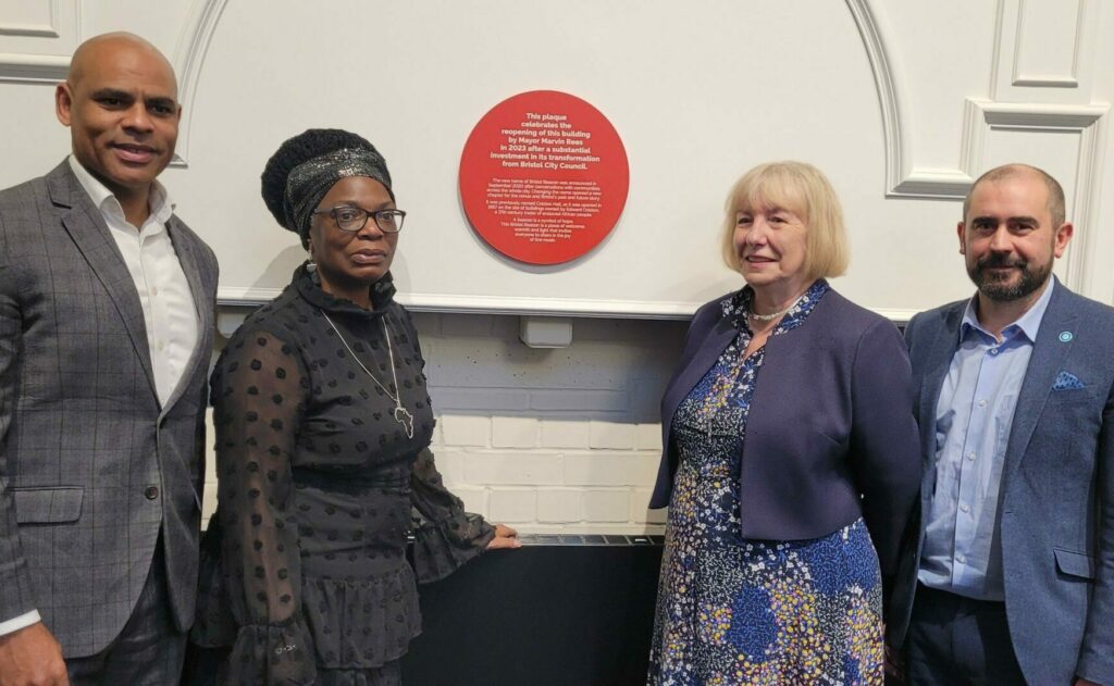 Former mayor Marvin Rees and former deputy mayors Asher Craig and Craig Cheney with former Beacon CEO Louise Mitchell at the unveiling of a plaque marking the city council’s contribution to the reopening of the Beacon – photo: Ellie Pipe
