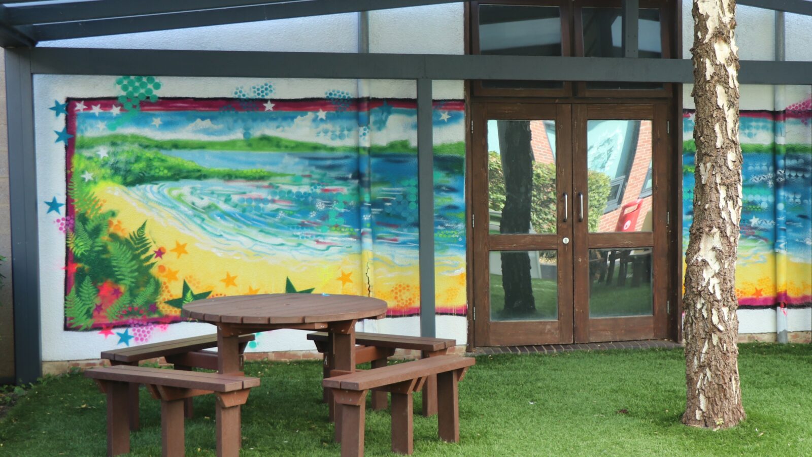A new mural in one corner of a Bristol secondary school shows a colourful seaside scene.