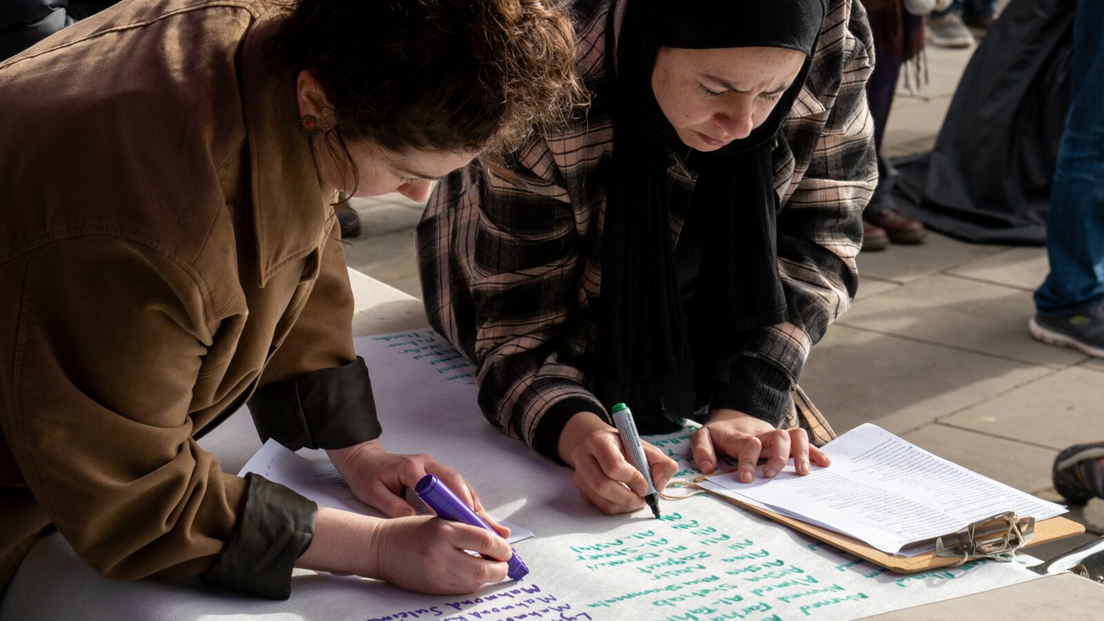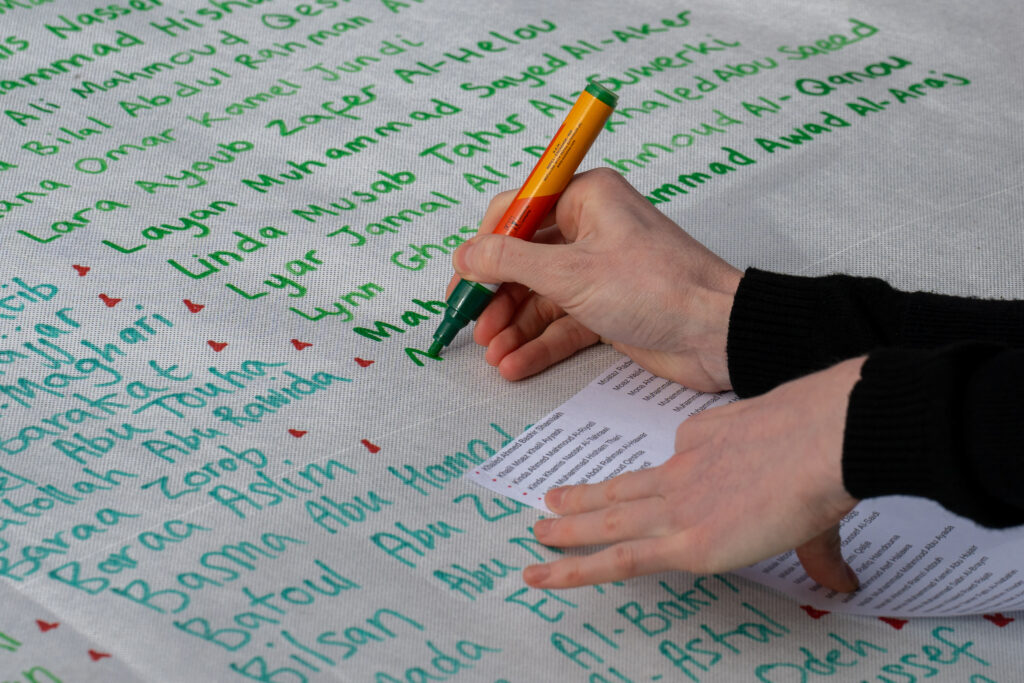 The names of Palestinian children killed are being written on scrolls – photo: Rob Browne