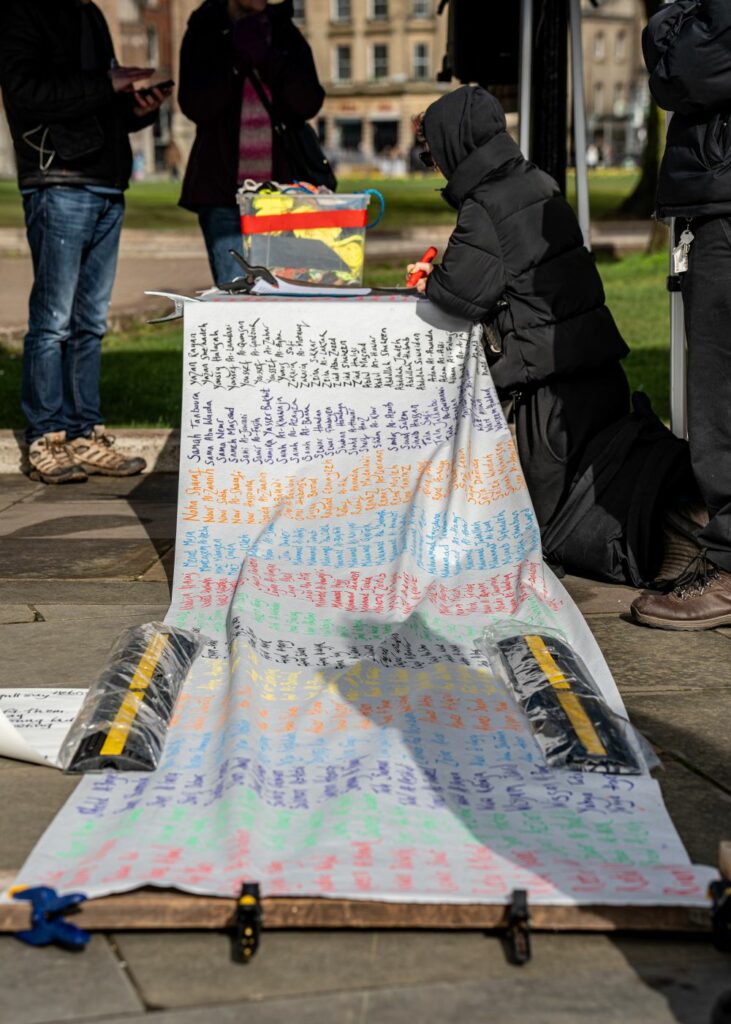 A ‘Naming the Dead’ event took place on College Green with a number of banners laid out on which people could write the names of children who have died in the ongoing conflict.