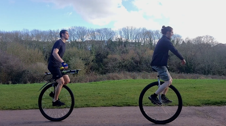 Ben Kirby and Bertie Bilsdon, circus artists from Bristol, will be unicycling 35 to 40 miles every day from Thursday to Sunday.