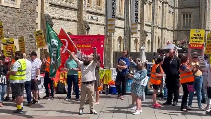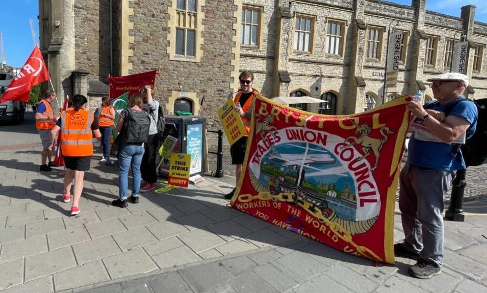 Workers on the picket line outside Temple Meads for the first day of the national rail strike – photo: Martin Booth