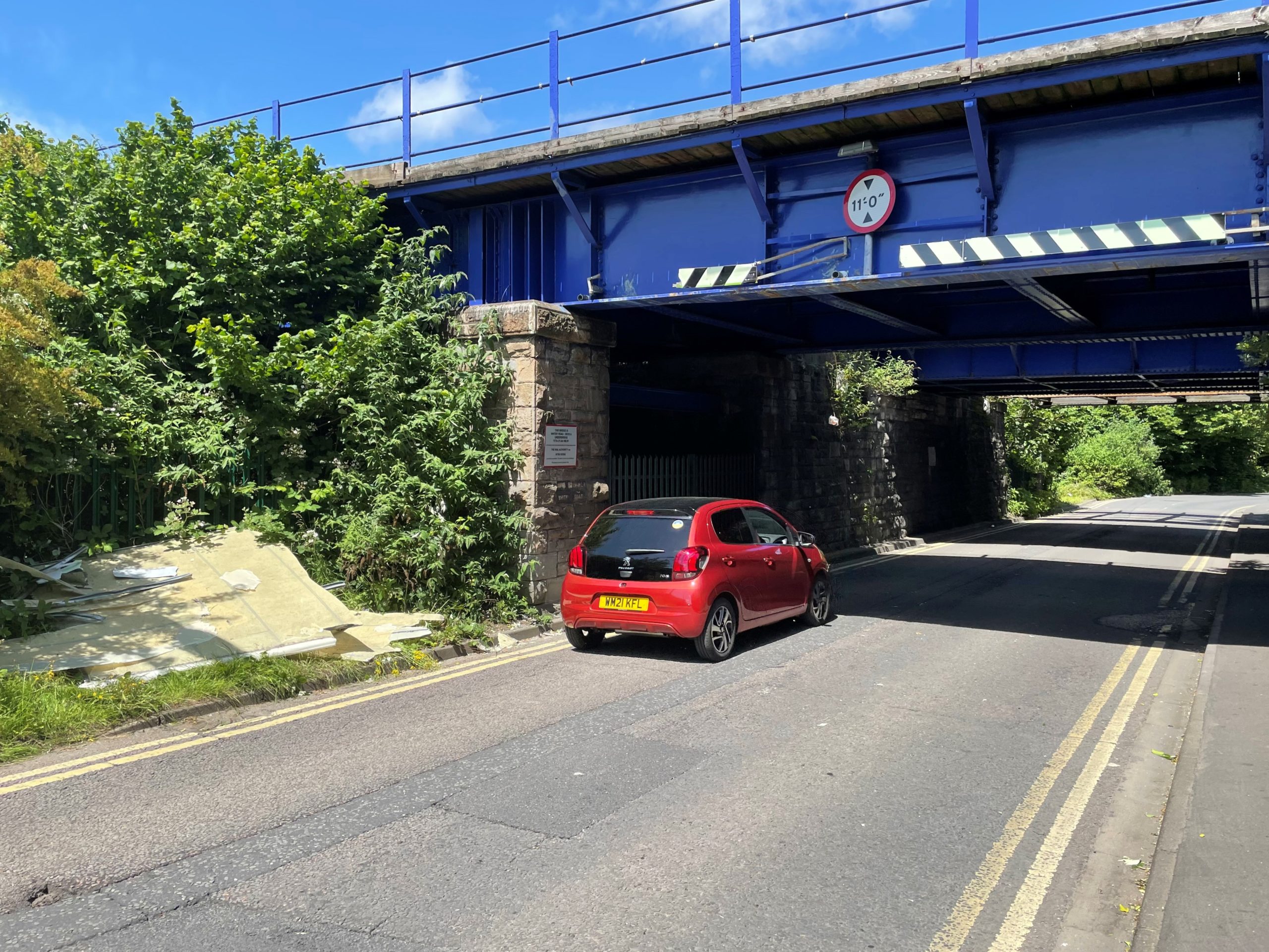 It was stuck underneath the railway bridge for some two hours, with part of its roof still on the floor next to the span, which is marked as being 11 feet high.