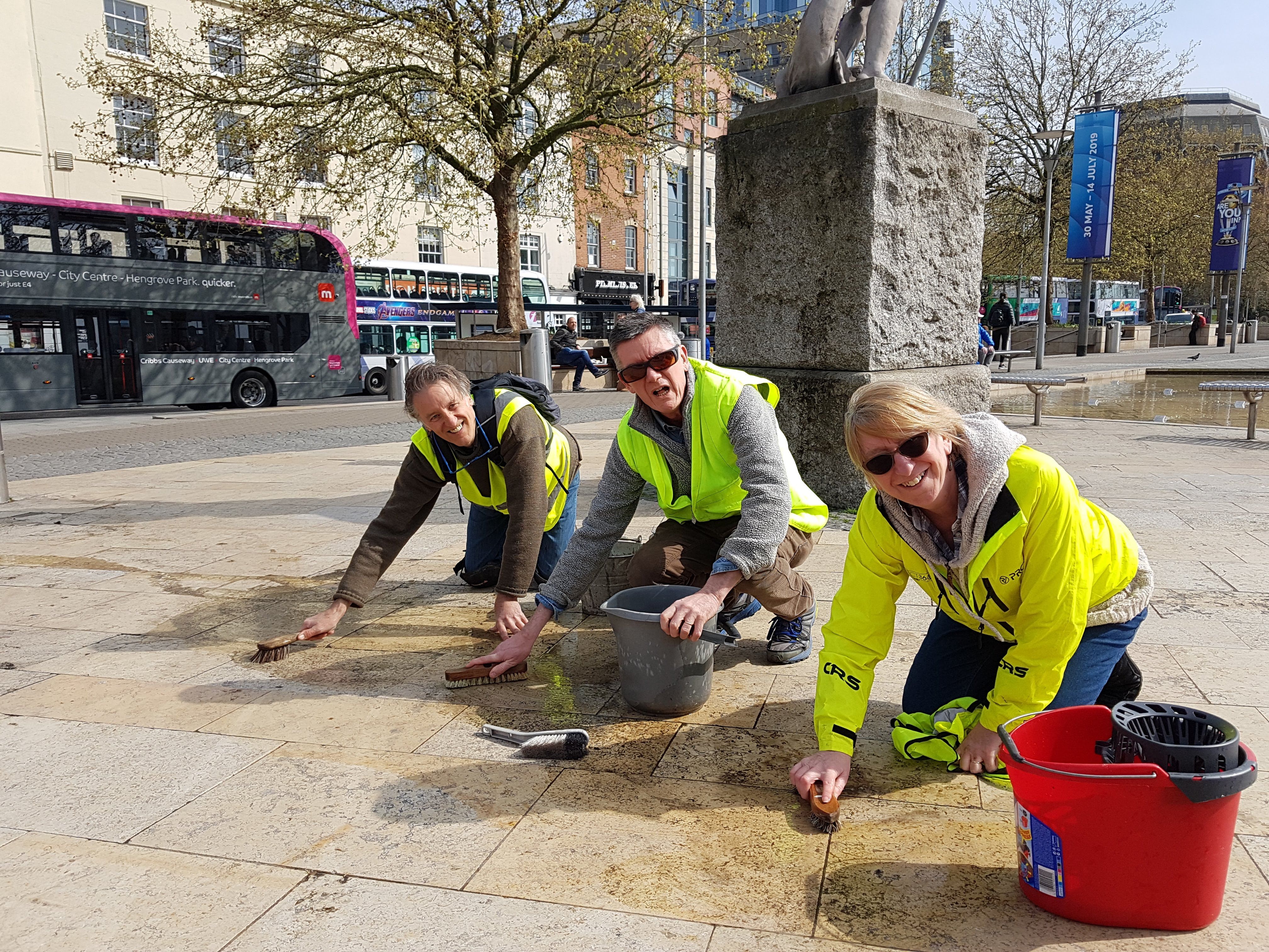 Jude and James Ritchie join Phil (far left) in his symbolic clean up of Bristol