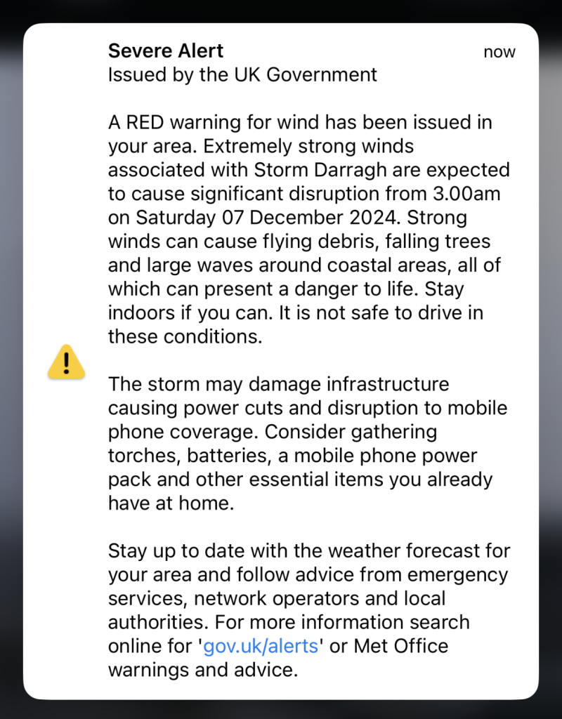 The alert also says that the incoming storm may cause damage to infrastructure including power cuts and disruption to mobile phone coverage..