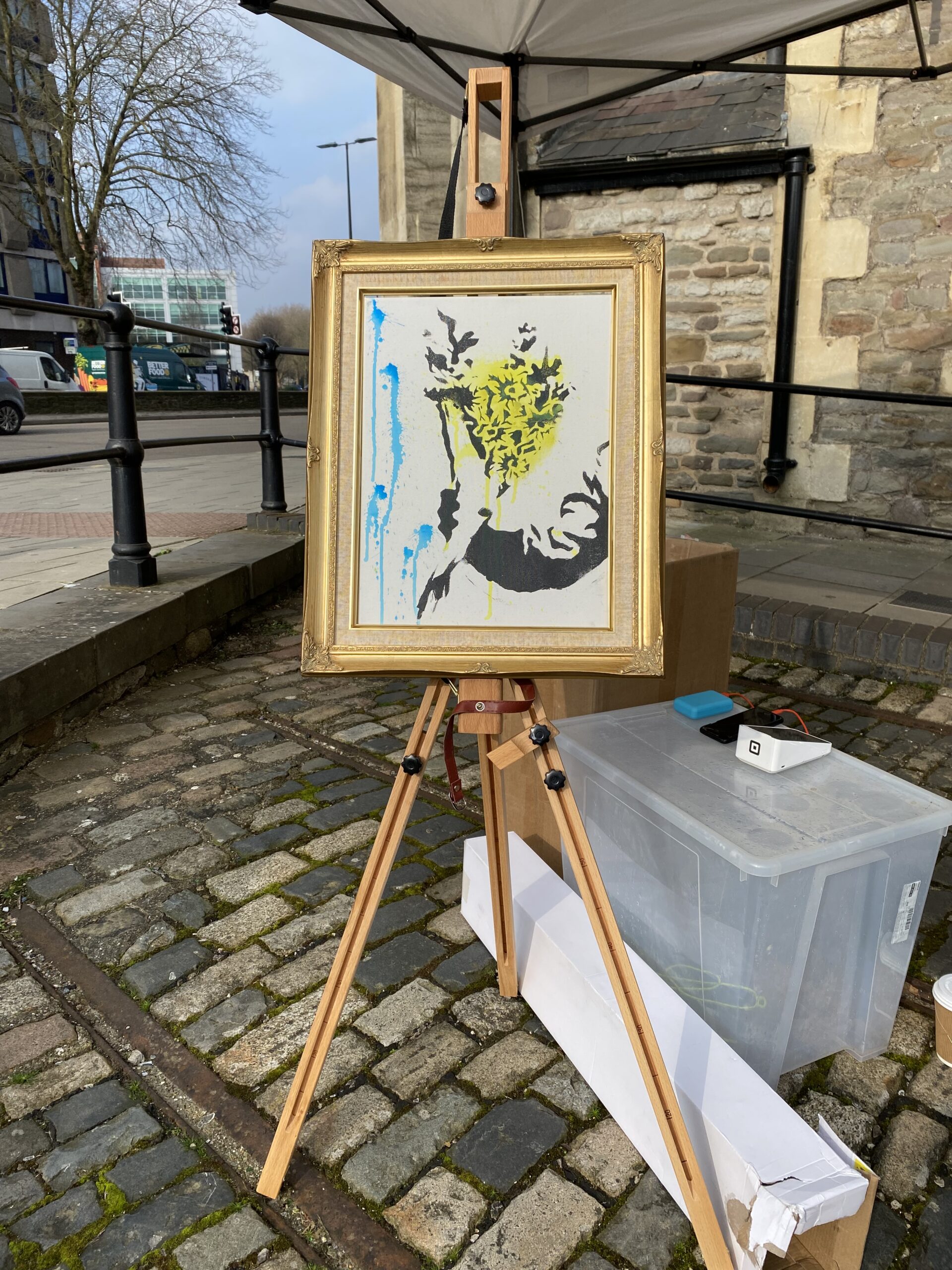 The washed out sign offers daffodils that you don’t need to water for £50. It’s part of a limited run of prints by Bristol street artist Rob Parkes, or Parsky.