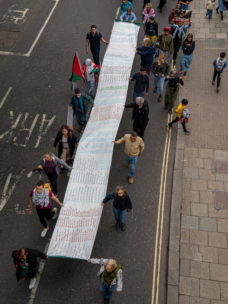 ‘Stop starving Gaza’ was on a banner at the front of the march while the names of hundreds of children killed had been written on sheets of paper carried by protesters.
