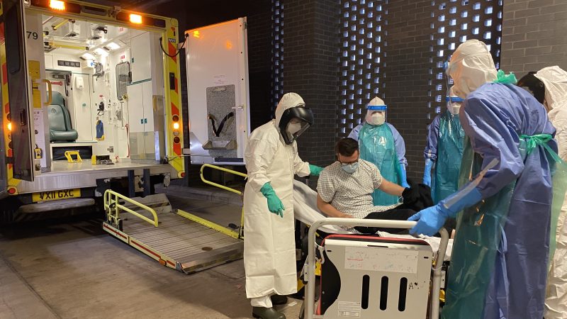 Colleagues from South Western Ambulance Service NHS Foundation Trust and other partners supported with the transfer of a person taking on the role of a patient with a confirmed HCID to run through PPE processes and the movement of patients to the isolation unit during the exercise.