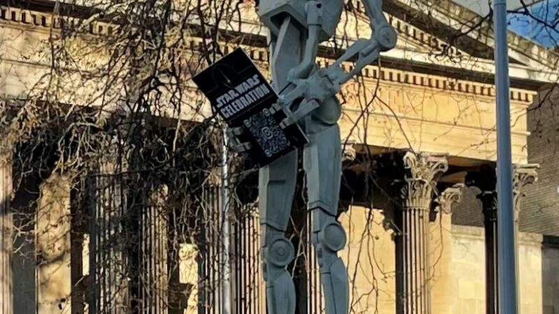 The droid on the plinth seems to be reading something on the back of which is written ‘Star Wars celebration’ and a QR code that links to Thomas’ Instagram page.