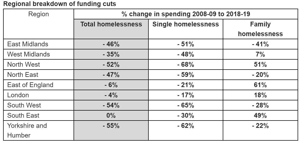 Regional breakdown of funding cuts to homelessness services. Source: The Local Authority Spending on Homelessness report commissioned by St Mungo’s and Homeless Link