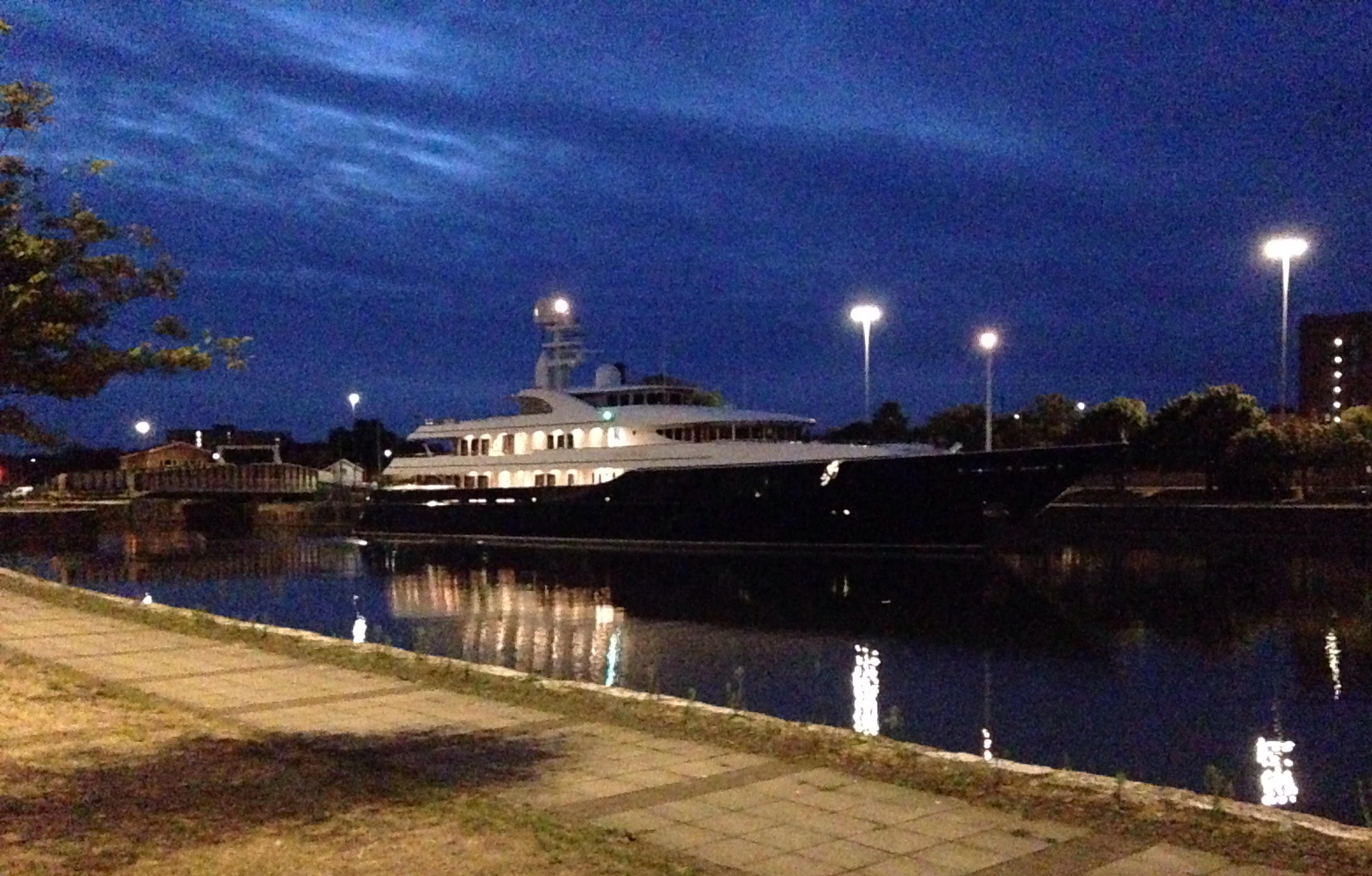 5.01am – the superyacht waits in the Cumberland Basin for the Plimsoll swing bridge to open