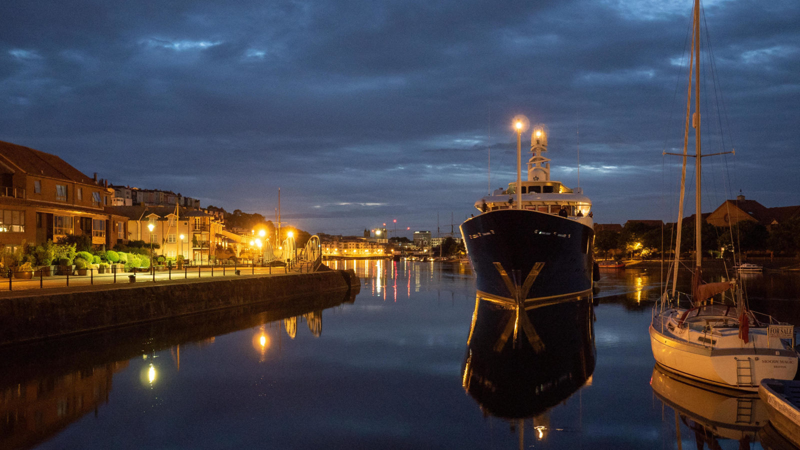 5.01am – the superyacht waits in the Cumberland Basin for the Plimsoll swing bridge to open