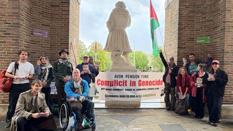 Pro-Palestine protestors first urged the Avon Pension Fund in December 2024 to divest from companies producing weapons being used by Israel in Gaza and companies profiting from illegal Israeli settlements in the West Bank.