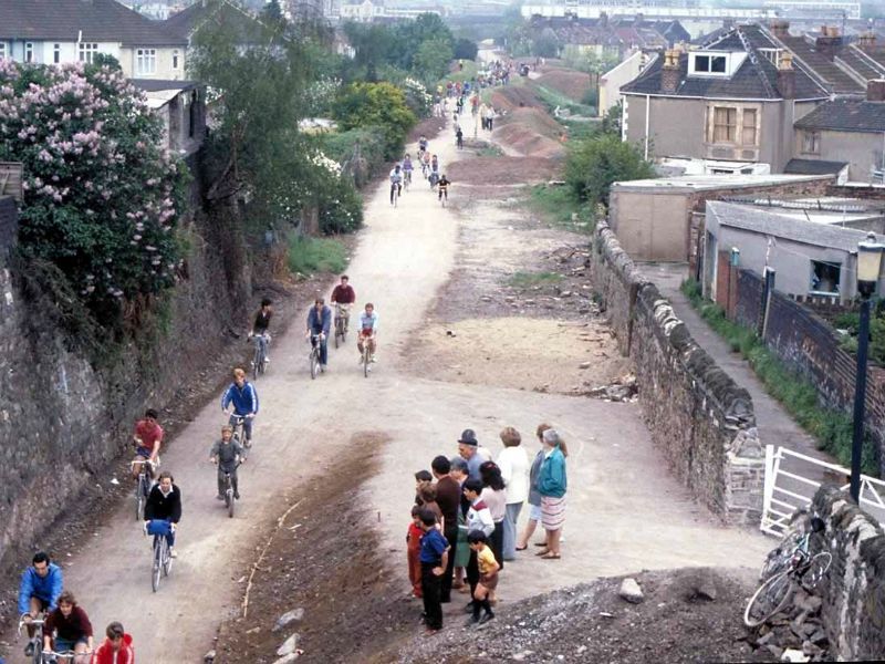The first ride on the Bristol & Bath Railway Path in 1983, looking towards Owen Square in Easton – photo: Sustrans