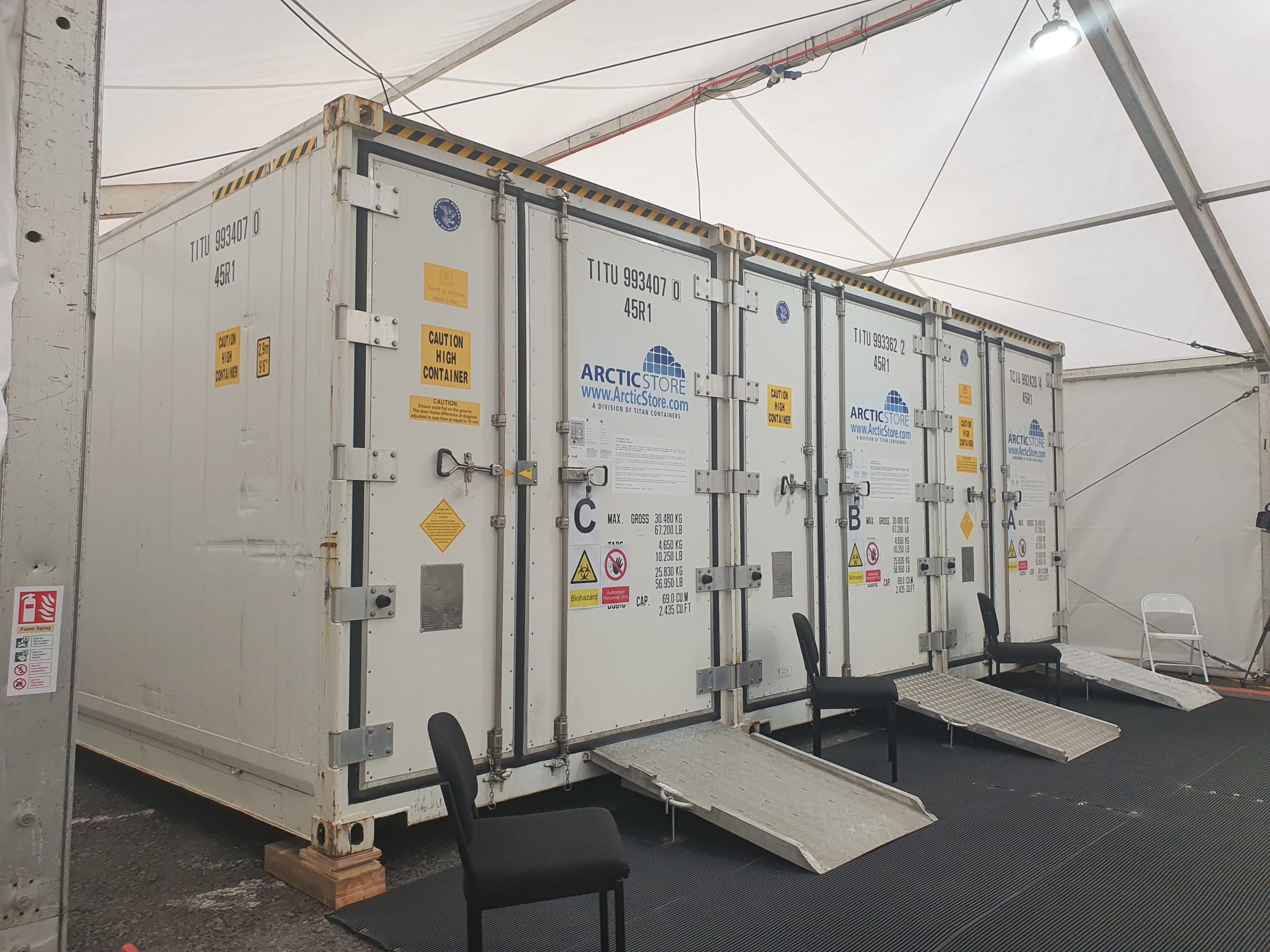 A large white gazebo covers the six temperature-controlled containers, which can accommodate up to 240 bodies.