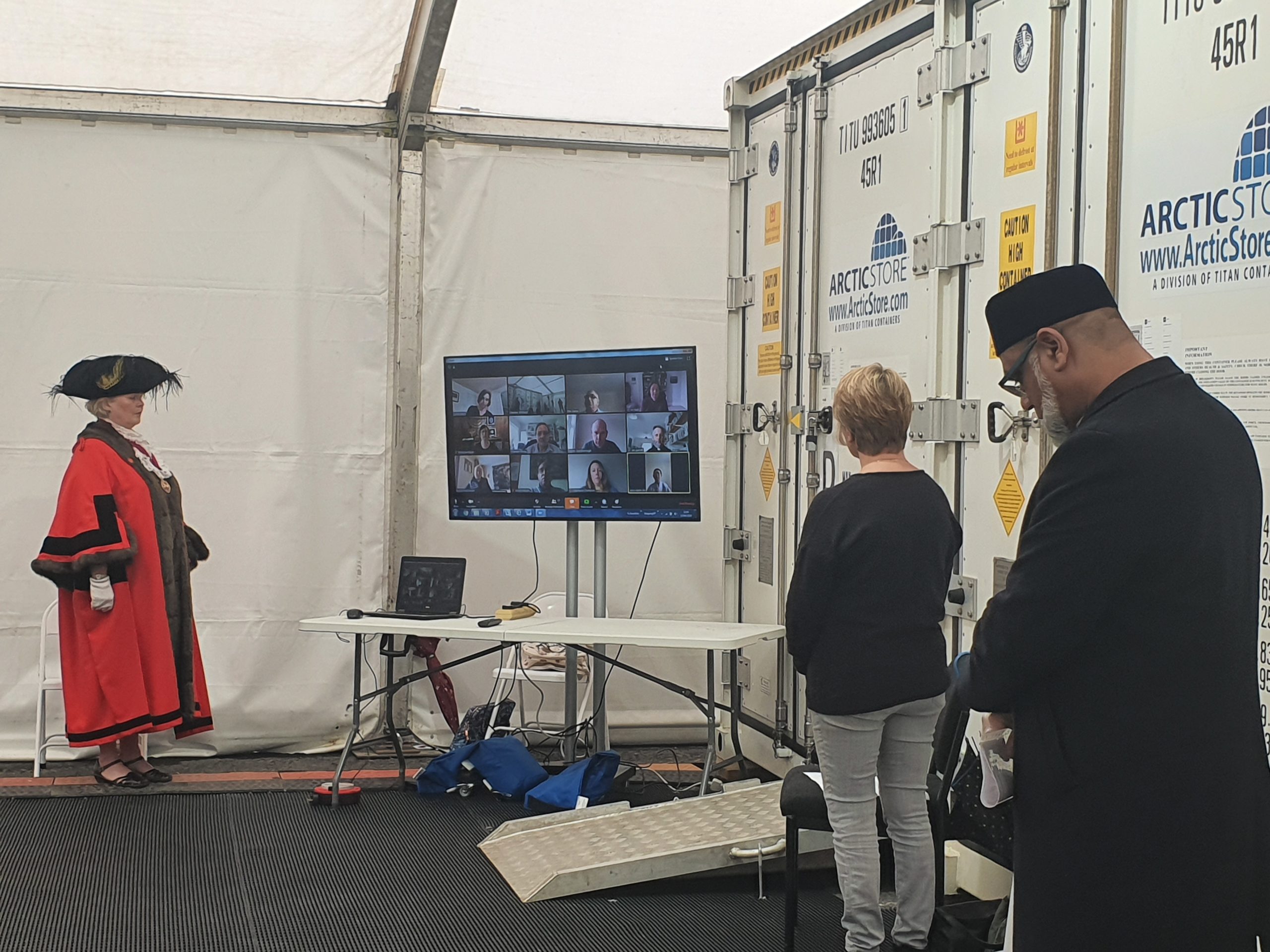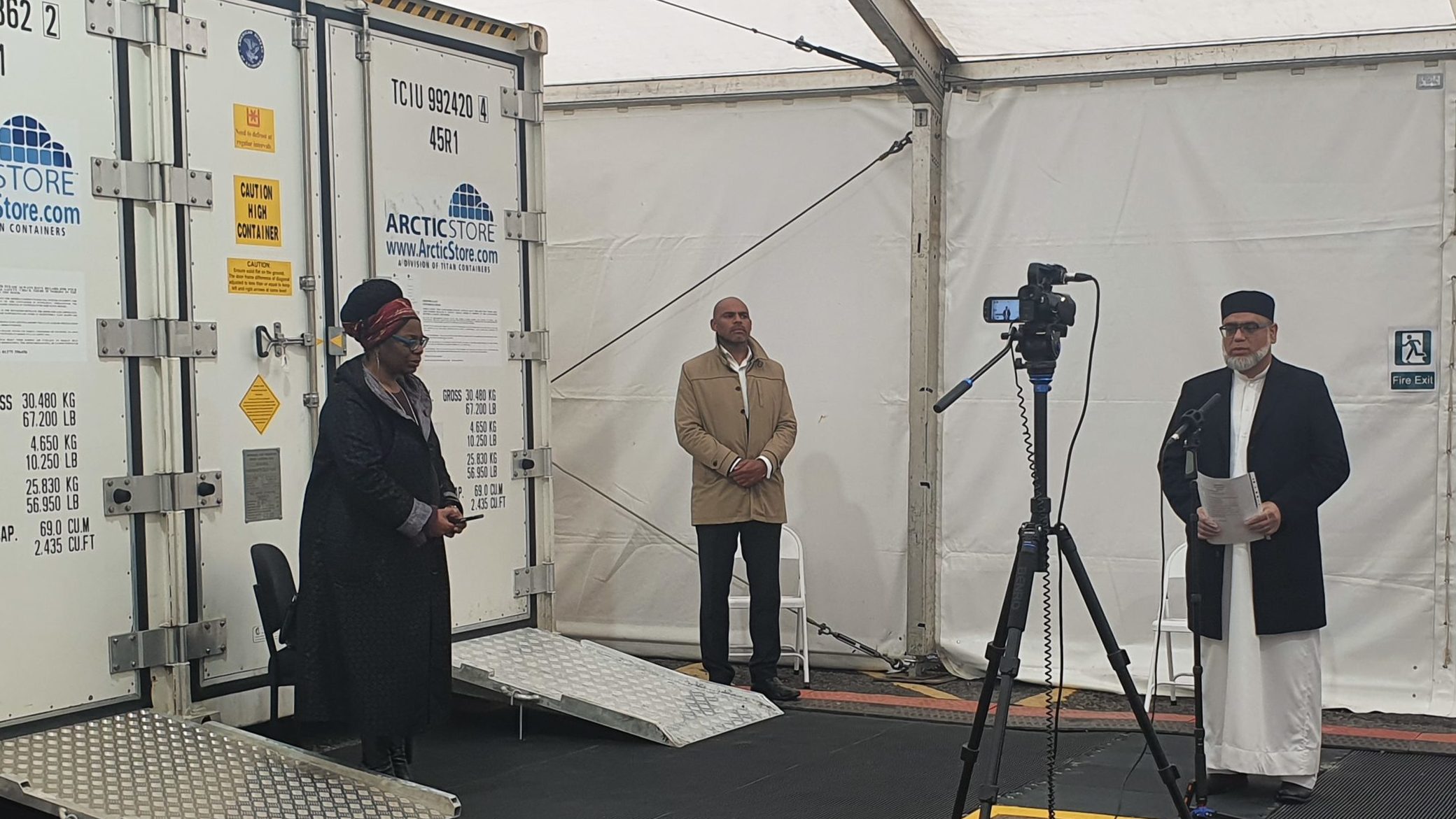 Lord mayor Jos Clark, Humanist celebrant Chrissie Hackett and Zaheer Shabir, representing the Muslim faith, all spoke inside the temporary building.