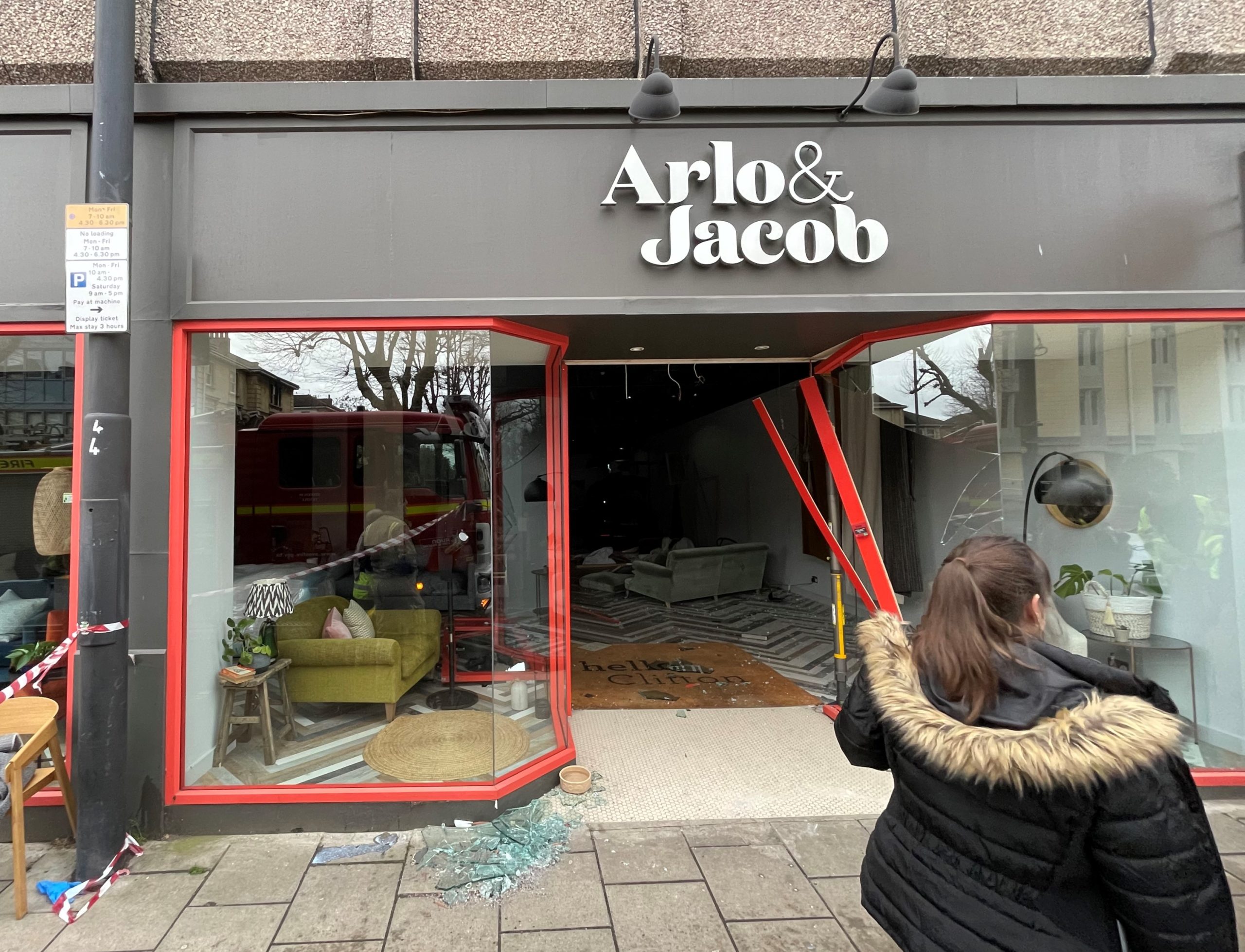 A cordon was put in place and shattered glass remained on the pavement for several hours after the incident at Arlo & Jacob, which also has shops in Fulham, Harrogate, Marlow and Islington.
