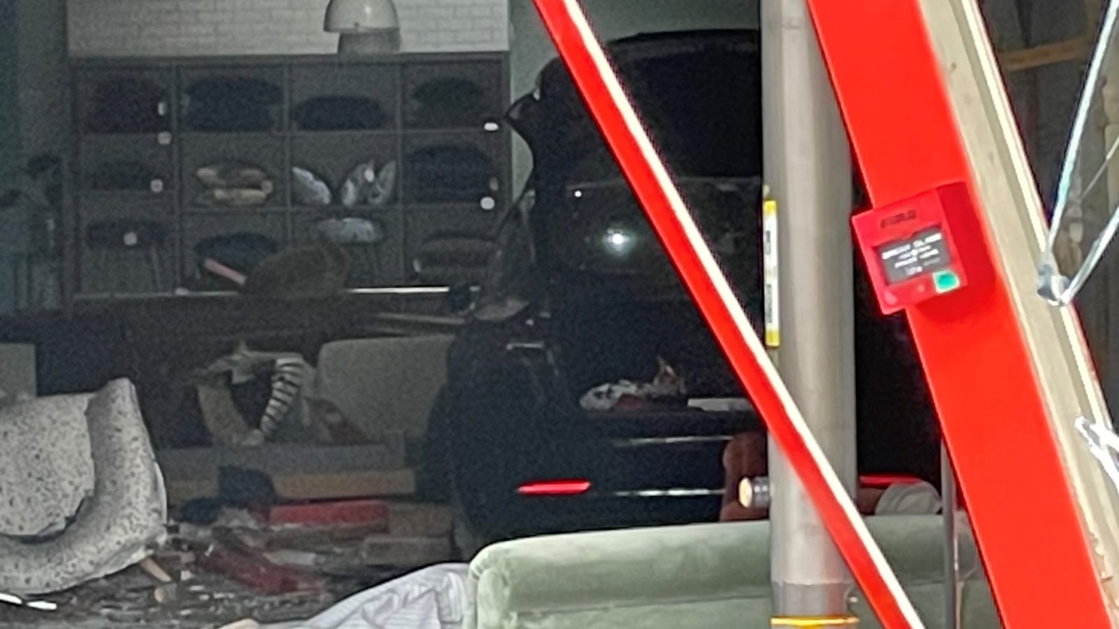 The dark-coloured Tesla appears to have entered through the front door of the shop, with fire crews erecting a metal jack to hold up part of the ceiling.