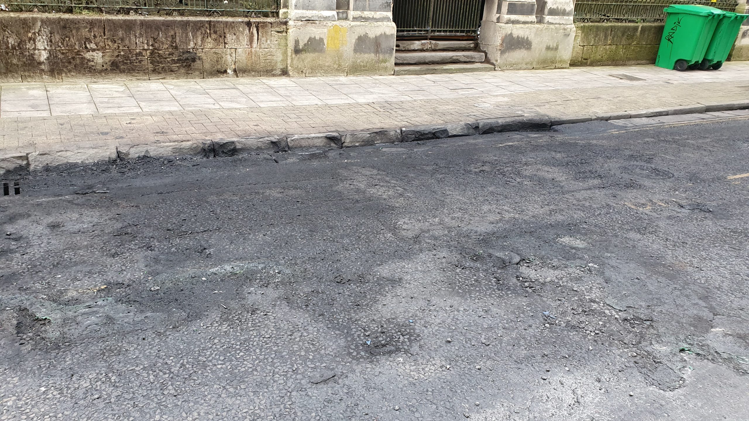 A charred, blackened patch from where a vehicle was set alight on Bridewell Street is one of the only remaining remnants of clashes on Monday morning.
