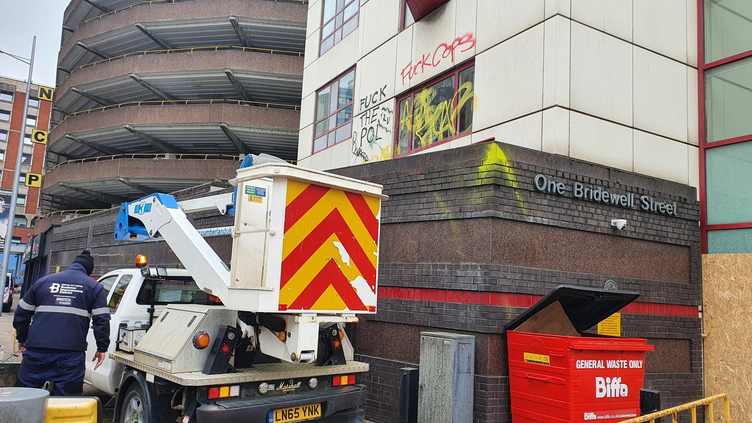 Cleaning crews get to work on the graffiti on the side of Bridewell Police Station
