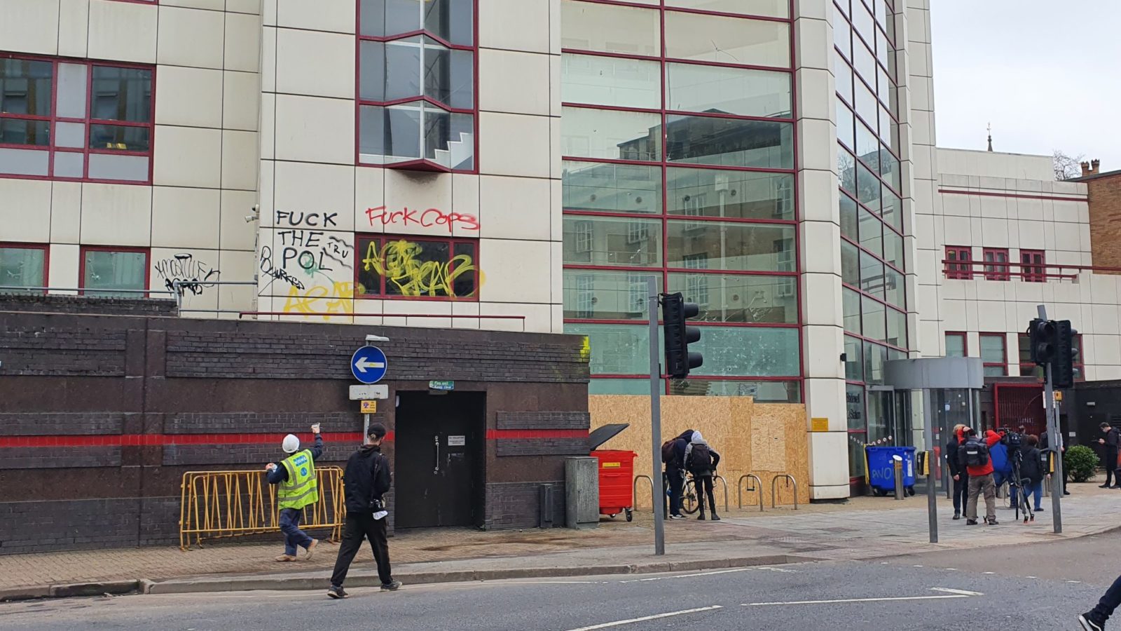 At 8am, ‘fuck the cops’ graffiti remains on the side of the building, where members of the press gather outside for hastily arranged interviews with police bosses. By 10am, a cleaning team has pulled up with a cherry picker and one man gets to work scrubbing off the tags.