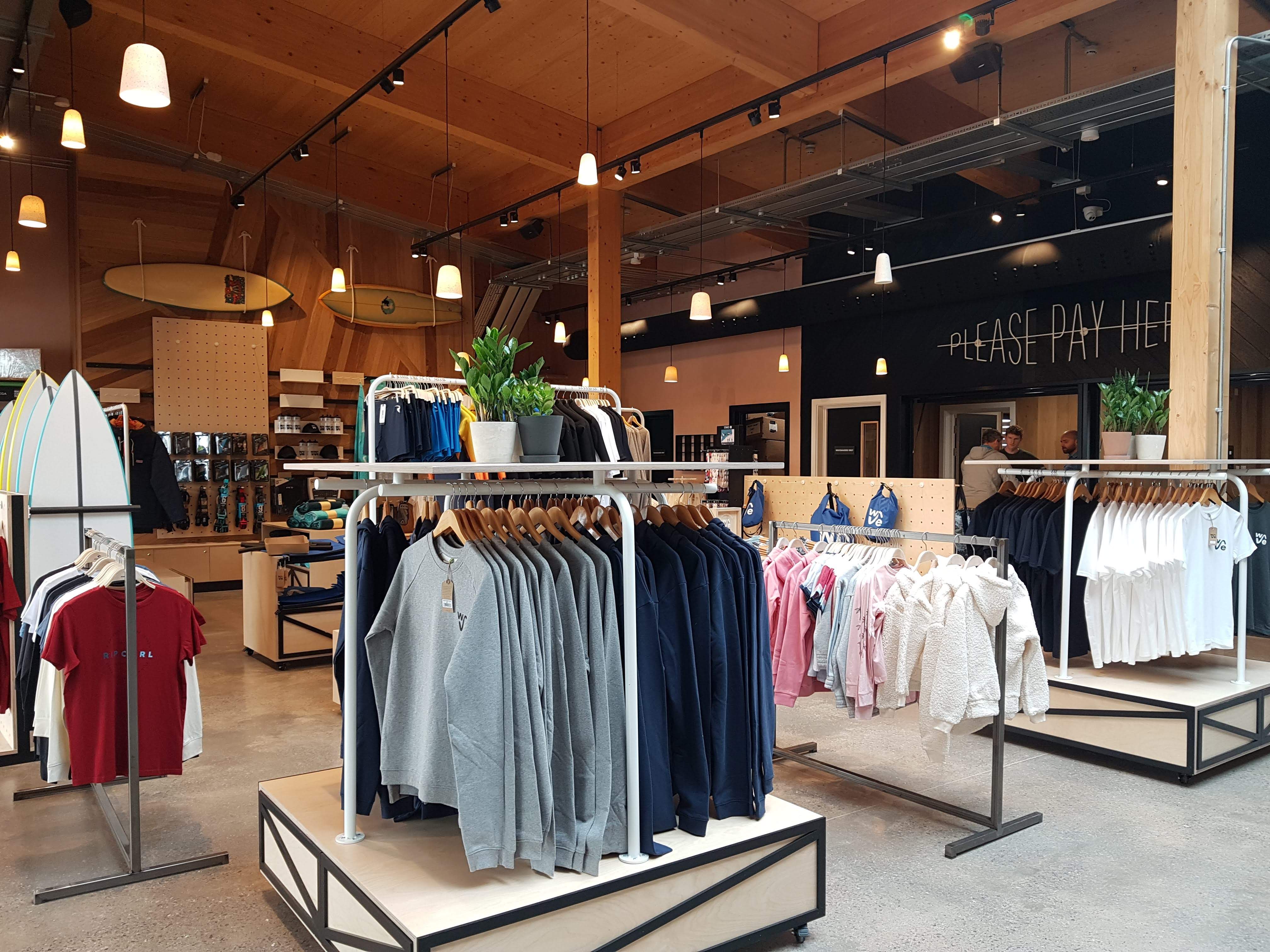 The tantalising smell of food wafts from the café and bar area to the left of the airy building, while to the right, racks of surfwear and paraphernalia are on display.