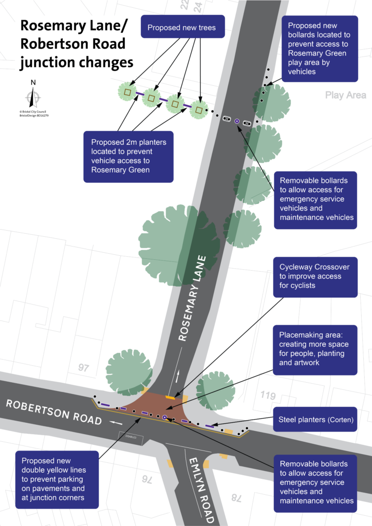 Plans for the closure of Rosemary Lane include improved access for cyclists and removeable bollards – map: Bristol City Council